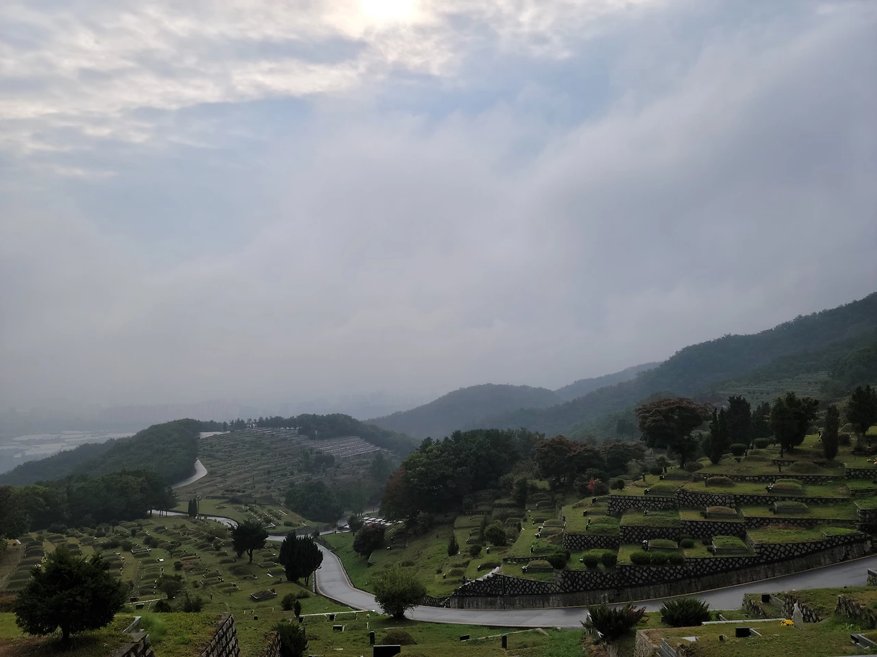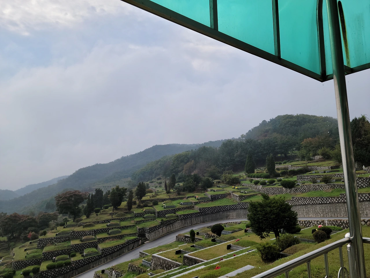 새벽까지 소설을 쓰다 잠들었던 나는 아침에 늦잠을 잘 뻔했다. 다행히 제시간에 깨어 늦지 않게 약속 장소에 닿을 수 있었다. 묘원은 생각보다 멀어서 지하철역에서도 택시로 20여분을 더 들어가야 했다. 비가 내렸으며 세상은 차분히 깨어 있었다.