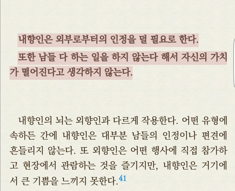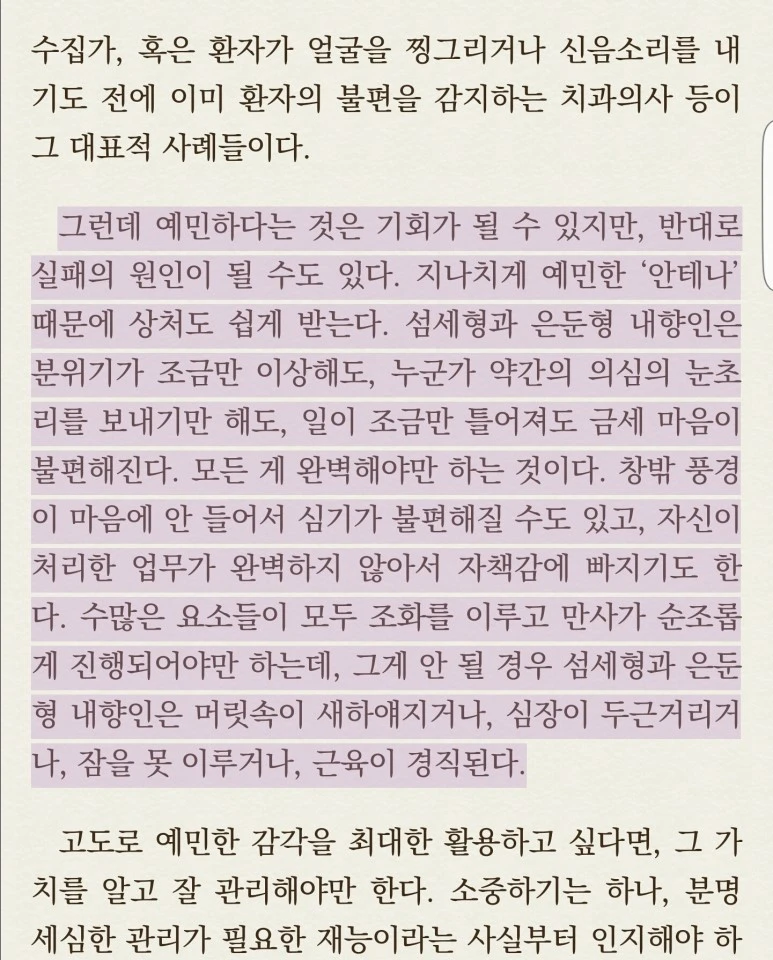 이책에서 주목할 만한 것은, 생각이 많은 이들이, 소위 내향형 인간이며 '안테나'를 세우고 사는 사람들이기 때문에 다른 사람들의 변화에 민감하고 흔들리기 잘 한다는 내용이었다.