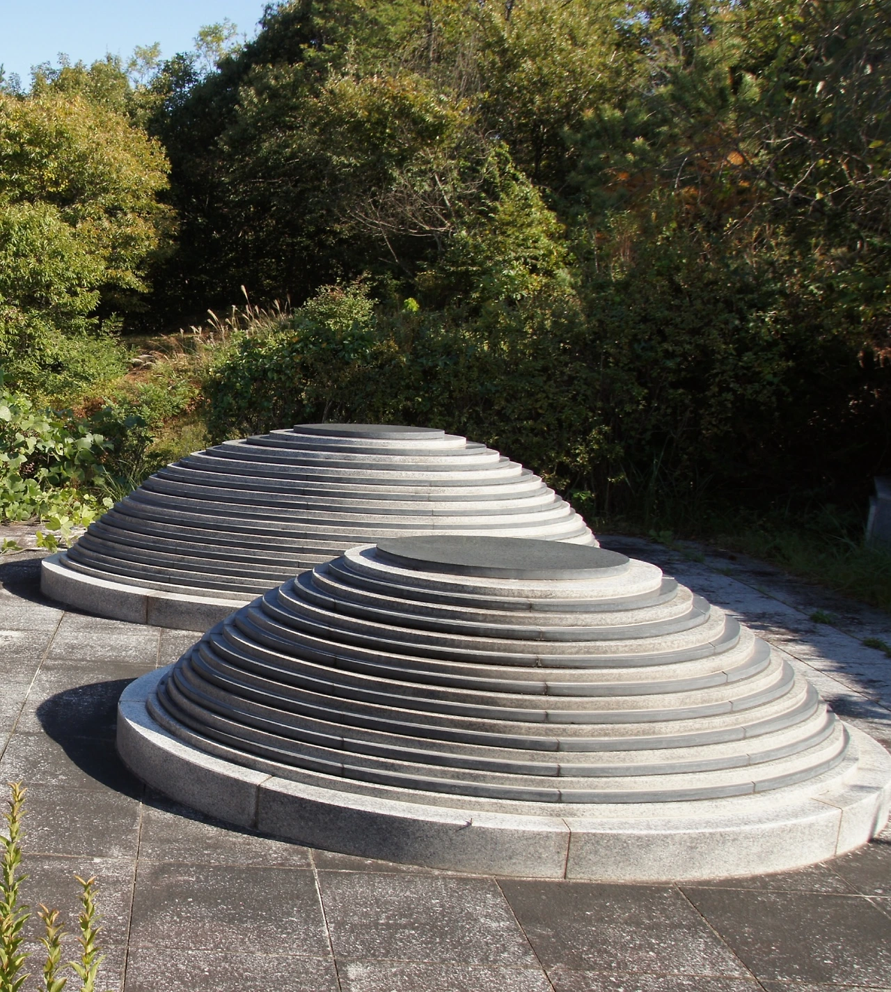 김환태, 박봉자 부부의 묘는 세상에서 처음 보는 독특한 모양새를 하고 있었다. 예술작품이다. 검고 흰 타원형의 납작한 평면 돌들이었다. 그 돌들이 크기를 줄여가며 교대로 쌓여져 있었다. 그런데 맨 위쪽의 돌은 제외하고 그 아래 돌들은 사방으로 틈새가 있었다. 조각돌들을 이어 붙였나 보다. 틈새가 있어 언제라도 돌을 깨고 망자가 환생할 수 있겠다는 생각이 들었다.
