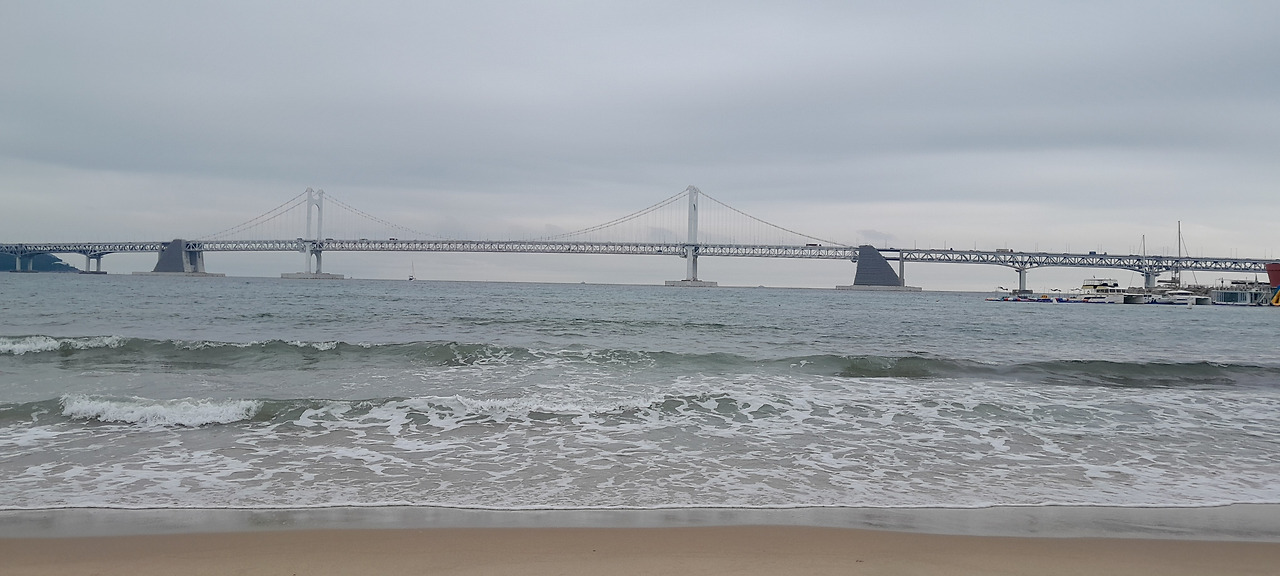 오전의 해운대해수욕장 바다는 늦은 오후의 광안리해수욕장과는 바라보는 느낌이 달랐다. 우선 멋지긴 해도 걸리적거리는(?) 것(광안대교)이 없다. 거기에 달맞이 고개에서 동백섬까지 사람의 시야 범위를 넘어설 정도로 폭이 넓다.