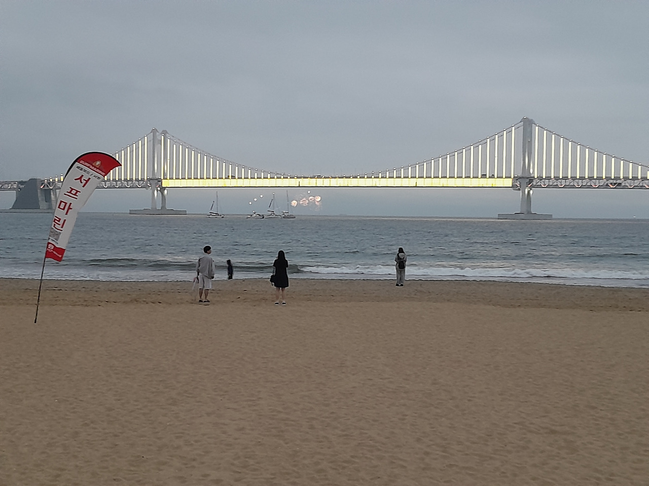 해질 무렵 광안대교 한가운데서 노란색 가로 조명이 켜졌다. 해넘이 시간이 다가올수록 색은 도드라져 갔다. 수첩을 접고 다시 모래사장을 걸었다. 많지 않은 사람들이 조명과 바다에 이끌려 발걸음을 더디 했다. 이내 대교 근처에 떠 있던 배가 미니 불꽃놀이를 펼쳤다. 사람들 사이에 낭만이 퍼졌다. 그러고 보니 나도 덩달아 두세 시간 이곳에 머물렀네.
