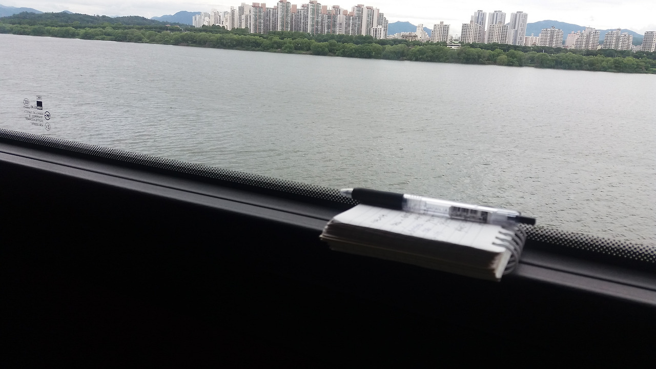 정선행 28인승 버스. 뒷부분 오른쪽 단일 좌석을 차지했다. 사무실처럼 아늑했다. 나처럼 창턱의 수첩과 펜도 폼나게 창밖 시원스러운 한강 풍경을 즐기는 눈치다.