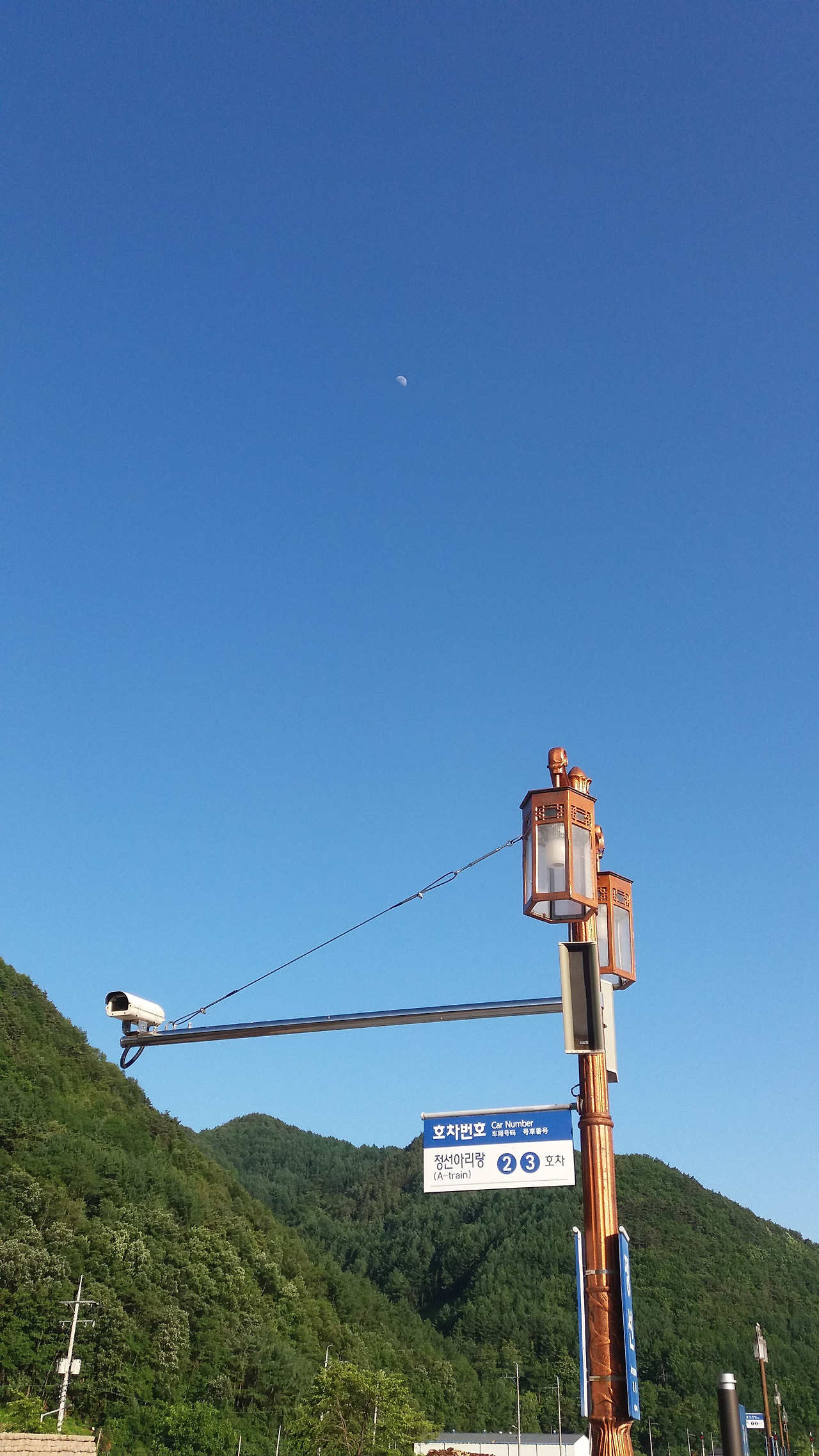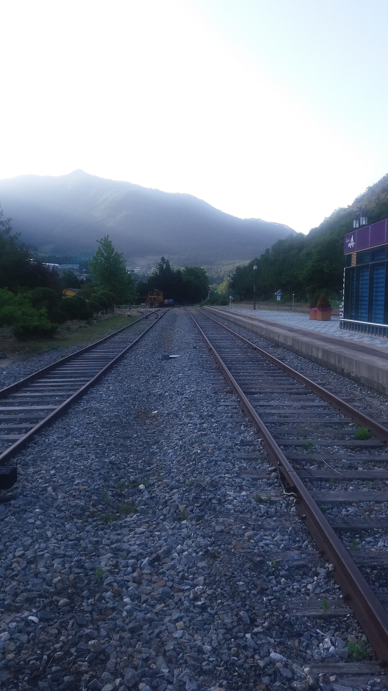 정선역 안으로 들어섰다. 한적한 플랫폼을 혼자 거닐었다. 역 앞의 병풍 같은 산과 양방향 기찻길은 여전히 아련한 여운을 지니고 있었다. 마음껏 거닐 수 있는 간이역에 역장이라도 된 듯 벤치에 앉아 쉬면서 늦은 오후의 여유를 즐겼다. 종류가 다른 새들이 한두 마리씩 교대로 나를 지켜보고 간다. 새들도 나에게 관심을 두는구나 싶었다. 하루에 두 번 열차가 도착하고 떠나는 간이역. 도심의 철로 주변과 달리 너무 뜸해서 열차가 그리운 간이역. 푸른 하늘의 낮 반달까지 예쁜 간이역.