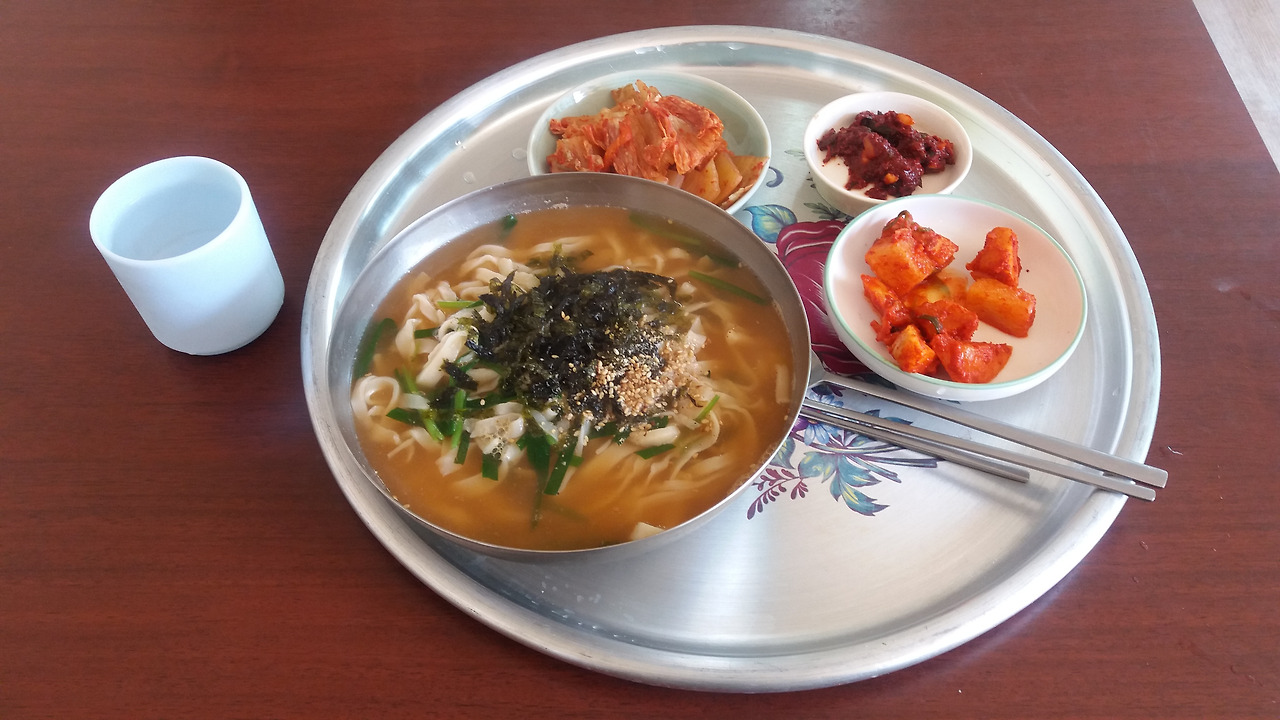 이번 여행에는 여인숙 맞은편, 로비에 제비집을 허락한 모텔에서 둘째 날을 묵었다. 아침 산책을 하고 이 ‘은혜식당’에 들어갔다. 노부부가 장사 준비를 하고 계셨다. 내가 첫 손님인 듯했다. 단출하게 나온 손칼국수와 김치. 할머니 손맛이 들어간 음식이었다. 입구 앞에는 전병과 부침개가 될 밀가루 반죽이 준비돼 있었다. 5일장이 있는 날이었다.