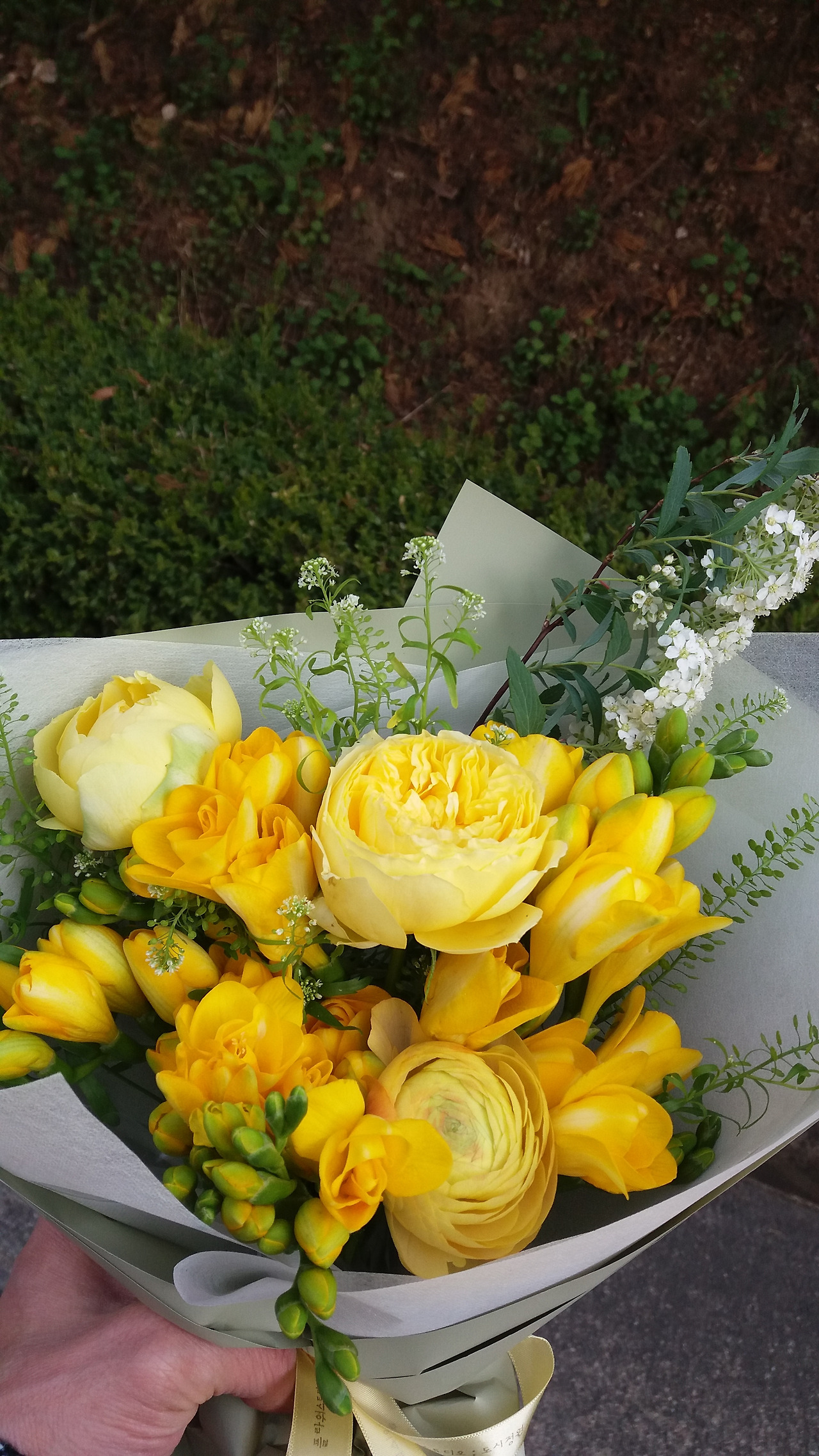 후배 내외 초등학교 3학년 딸 이름은 '봄' 외자이다. 명함에 ‘국가공인화훼장식기사’라고 직함이 적혀 있는 주인장에게 이 후배 가족을 언급하면서 알맞게 꽃다발을 만들어 달라고 했다. 그랬더니 노란색과 흰색의 봄꽃들로 멋지게 꽃다발을 만들어 주었다. 장미, 프리지어, 라넌큘러스, 조팝나무 꽃, 냉이초가 모였다. 바깥 공원에서 슬쩍 해온 조팝나무 꽃 아니냐고 농을 쳤더니 시장에서 산 비싼 꽃이라는 답변이 날아왔다.