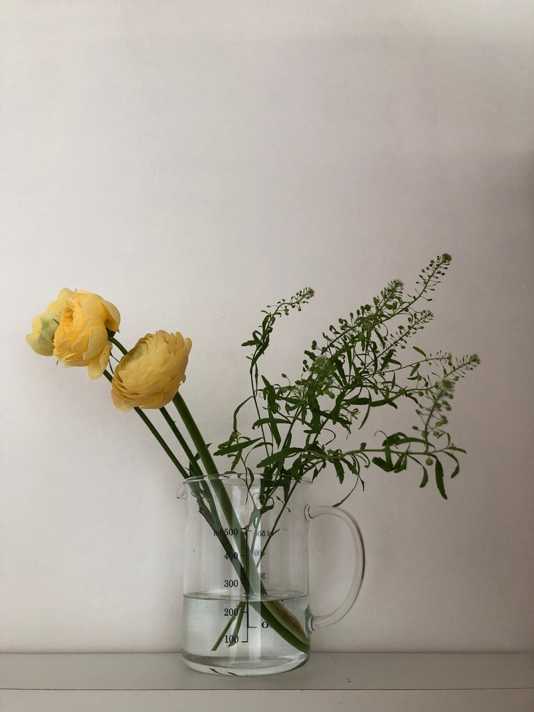 지난주 일요일 불문학과 후배에게서 온 카톡 문자다. 황홀하다고 할까 정말 멋진 화병 사진과 함께. 연노랑의 장미, 라넌큘러스에 흰 꽃이 자잘하게 피어나기 시작한 냉이초가 색깔별로 좌우를 향하며 백색의 벽지 앞에서 안정된 자세를 취하고 있었다. 계량컵이 화병이 될 수도 있구나 싶었다.