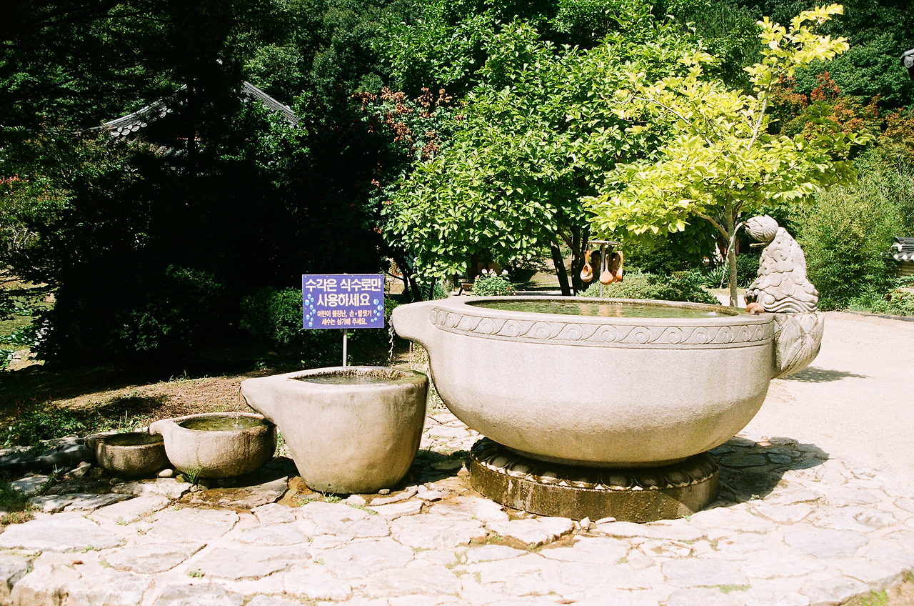 크기가 다른 네 개의 돌 사발은 자신의 역할인 물의 모음과 흘려보냄을 1년 내내 이어갔을 것이다. 그렇게 마름이 없는 물 정자의 풍취를 유지했을 테고. 가장 맑은 맨 위의 돌 사발 물은 공양을 바치거나 차를 끓일 때 쓰이고 그 아래는 밥물, 세숫물 등으로 차등해 쓰인다고 한다. 절을 찾는 이들에겐 당연 맨 위의 돌 사발 물을 약수로 제공한다. 이곳 약숫물을 20년 만에 다시 마셔보았다.