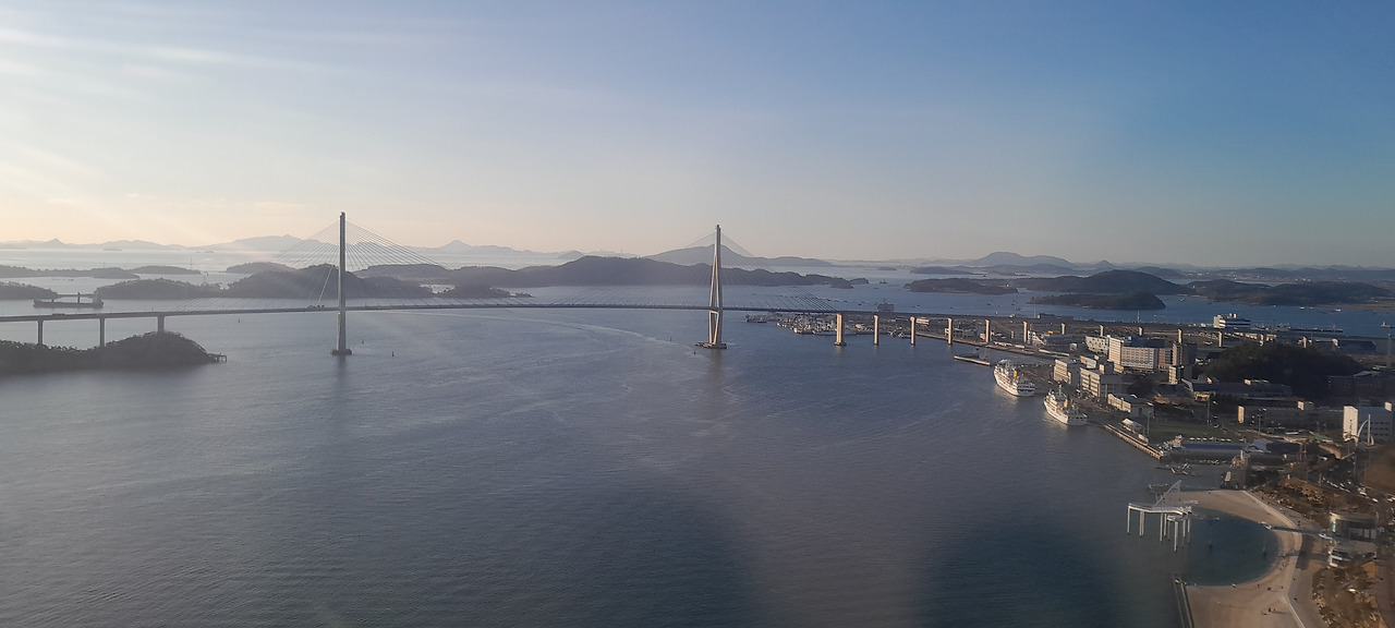 유리창을 통해 사방으로 목포 시내를 볼 수 있었다. 고소공포증이 적은 나는 투명 바닥을 통해 밑을 마음껏 내려다보았다. 케이블카가 돌산인 유달산을 오르내릴 땐 암벽과 바위와 나무가 보였다. 고하도까지 바다 위를 날 때는 유람선과 고깃배가 지나가는 바닷물이 보였다. 오른쪽 창으로 목포 북항에서 고하도까지 연결돼 있는 목포대교가 보였다. 거대했다. 목포대교는 비상하는 두 마리 학 모양의 케이블 부분을 양쪽 기둥으로 삼고 있었다. 배들이 원양에서 항구로 들어오는 바다 위 관문이다.