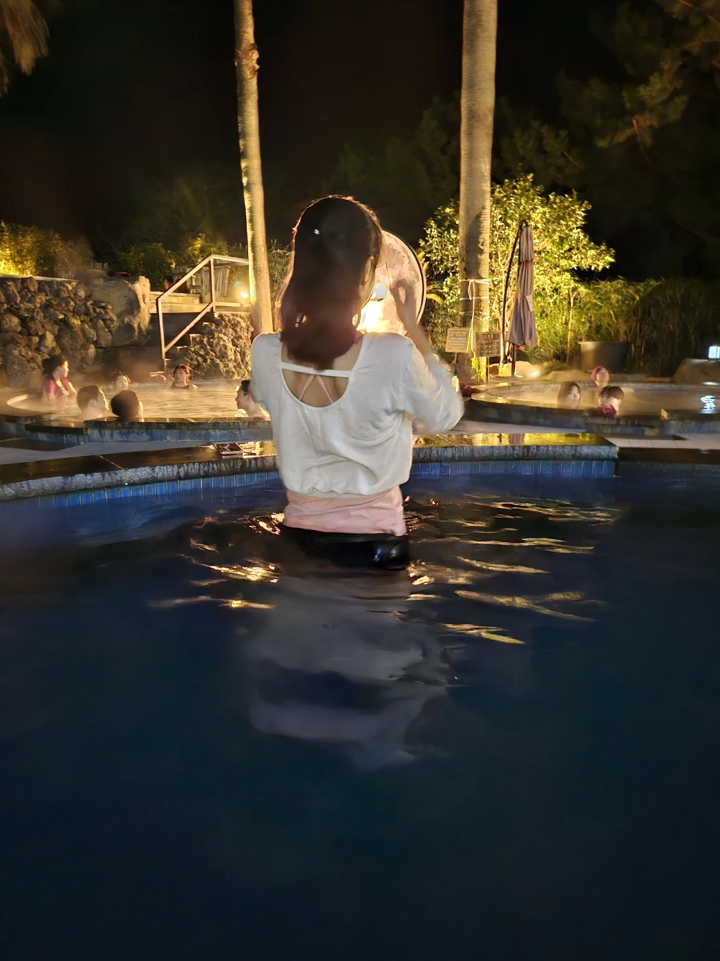 그리고 이곳은 산방산 근처 온천인데 뷰가 좋다. 낮에는 산방산도 보일 텐데 밤에는 달조명이 보인다. 실내 온천과 불가마도 있는데 제주여행 중 피로를 풀기 좋을 것 같다.