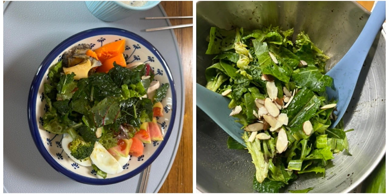 이 사진을 보면 상추와 각종 샐러드용 채소에 토마토, 단호박, 아몬드, 전복을 넣고 발사믹 소스와 올리브유를 뿌린 것을 볼 수 있다.