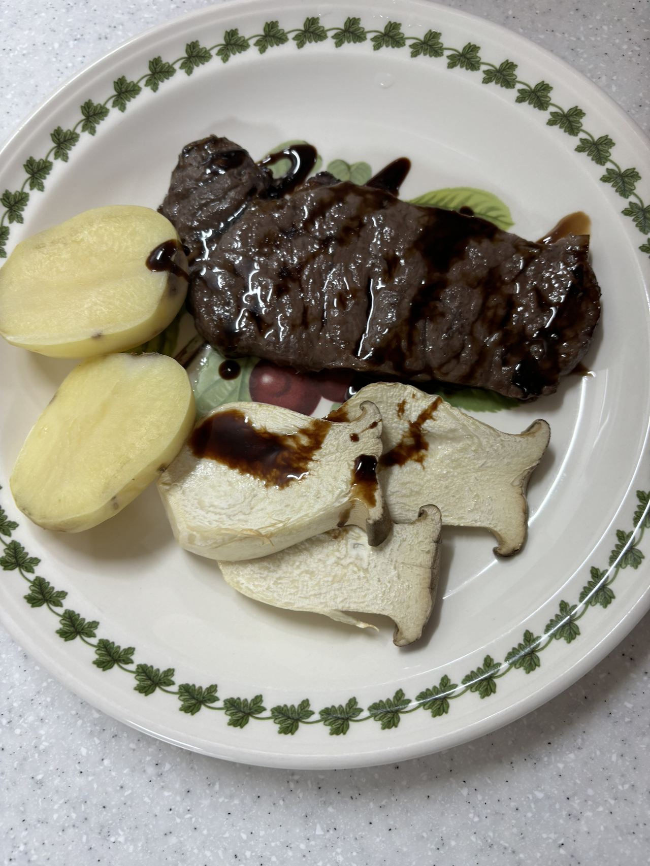 다음은 스테이크이다. 집에서 오븐에 구운 스테이크이다. 고기를 먹을 때에는 굽는 것보다 삶거나 찌는 것을 추천하지만 지방이 적은 부위라면 구워 먹어도 된다. 부챗살은 단백질이 20g, 지방이 6g으로 훌륭하다. 소고기 위에는 위에는 다이어트에 좋은 발사믹 식초를 뿌렸고 토마토와 브로콜리, 올리브, 버섯을 곁들였다.