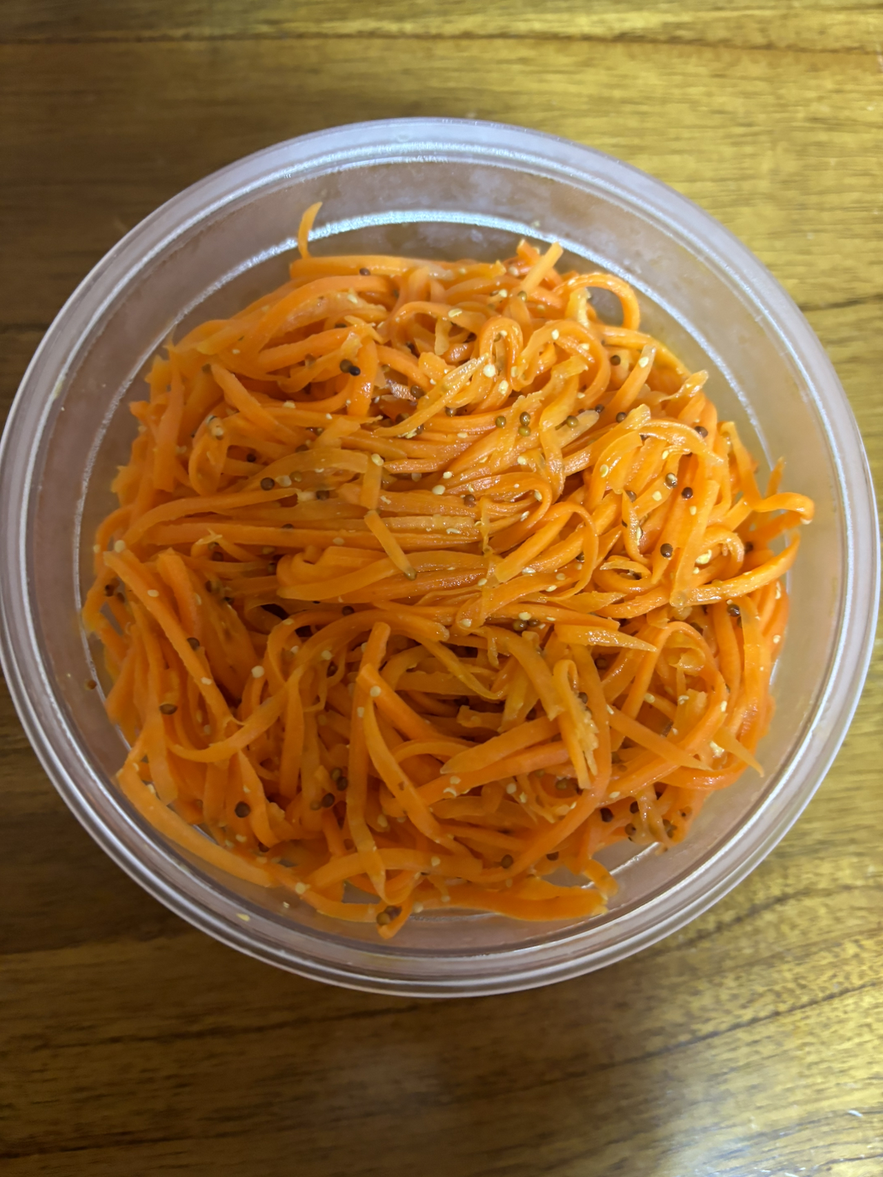 오른쪽은 당근라페인데 채 썬 후 올리브오일, 화이트발사믹, 머스터드에 버무린 프랑스식 샐러드이다. 이 당근라페를 빵이나 샐러드, 고기와 같이 먹어도 좋다.