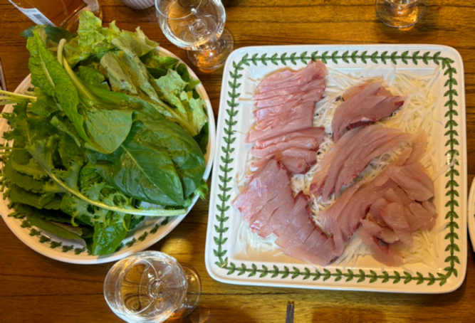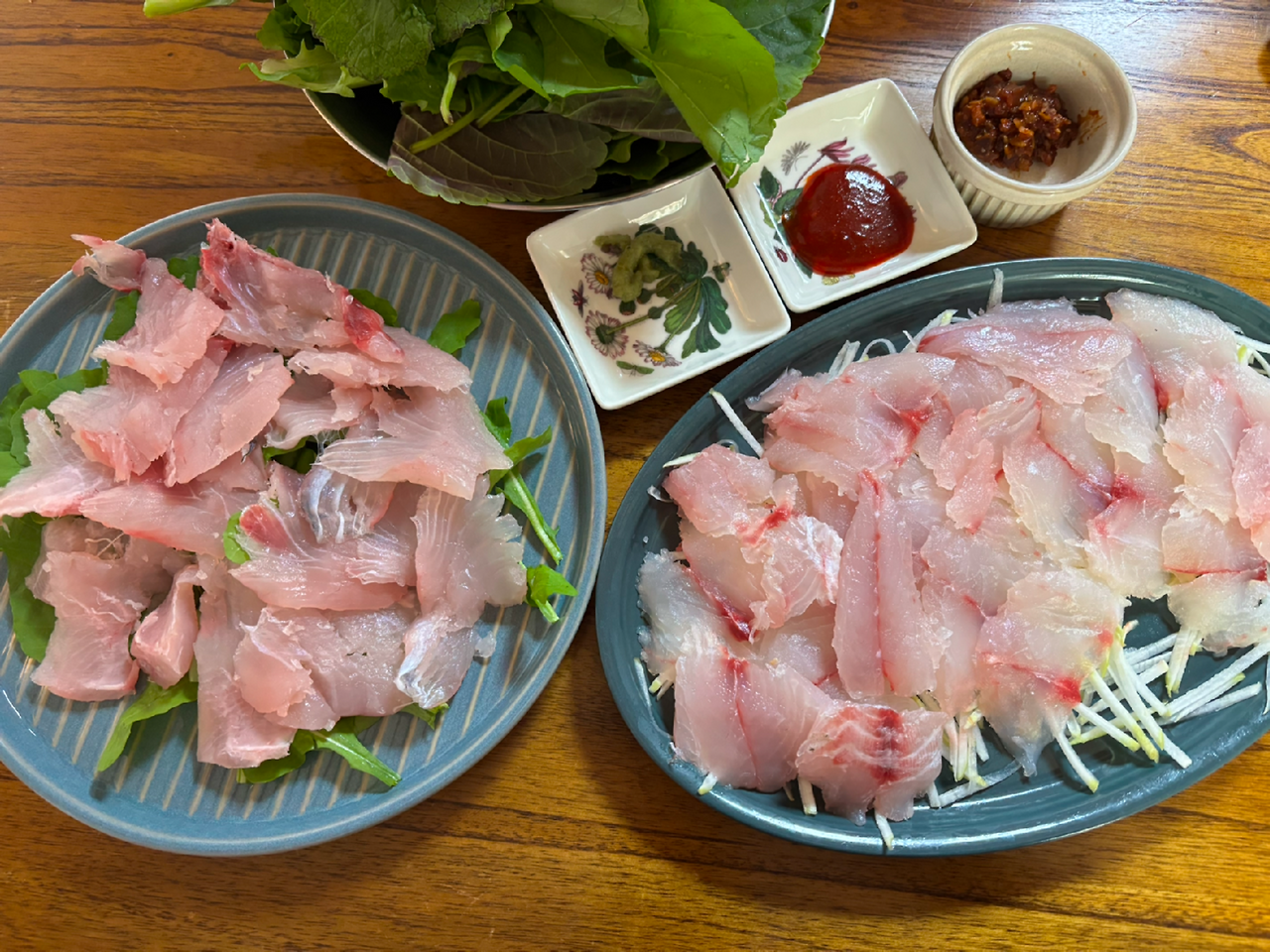 이 생선 또한 제주에서 만난 인연으로 받은 생선이다. 겨울 대방어철에 방어를 많이 잡았다며 한 분이 한 마리를 주셨는데 덕분에 바로바로 잡은 싱싱한 회를 먹을 수 있었다. 아버지가 어설프게 집에서 회를 뜨셨고 무채를 깔았는데 갑자기 잔칫날이 된 것만 같았다. 당시 대방어 축제 기간이었는데 축제를 가지 못해 아쉬웠는데 뜻밖에 횡재를 얻게 되어 좋았다.