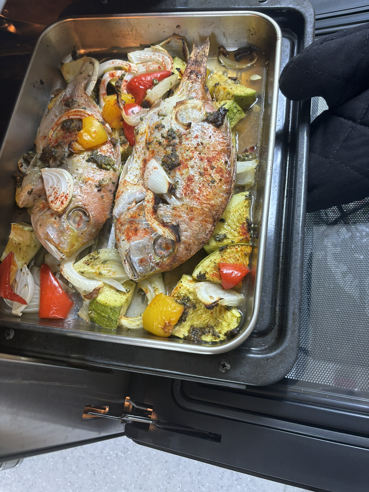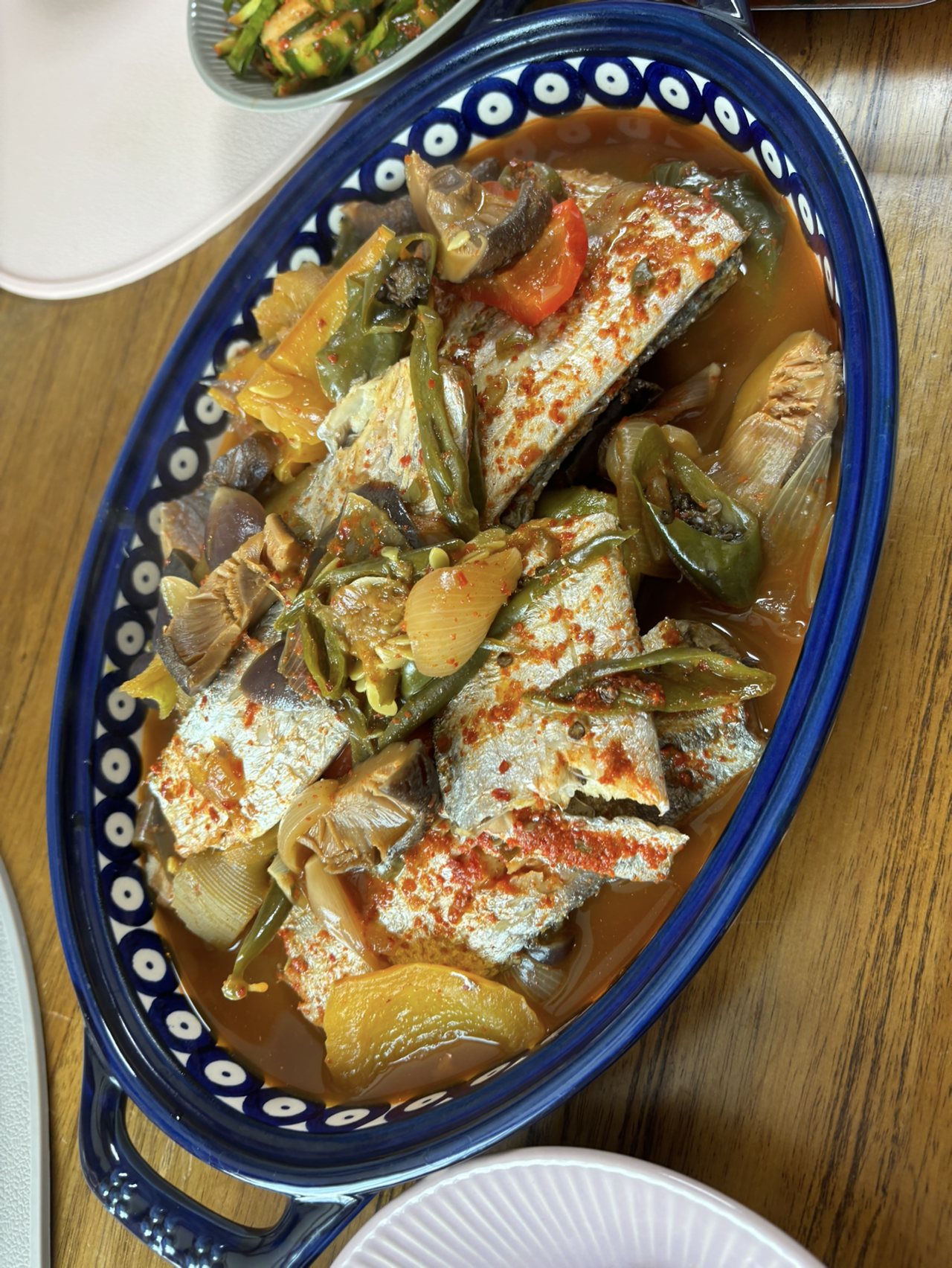 제주사람들은 옥돔만을 생선으로 칠 정도로 옥돔은 제주를 대표하는 생선이다. 옥돔은 임금님 수라상에도 올랐고 지방이 적고 단백질이 풍부한 귀한 생선이라고 한다. 식당에서도 가끔 먹곤 했는데 집에서도 어머니가 집에서 해주셨다. 사진은 옥돔에 직접 만드신 바질페스토와 각종 야채들을 오븐에 구운 요리이다.
