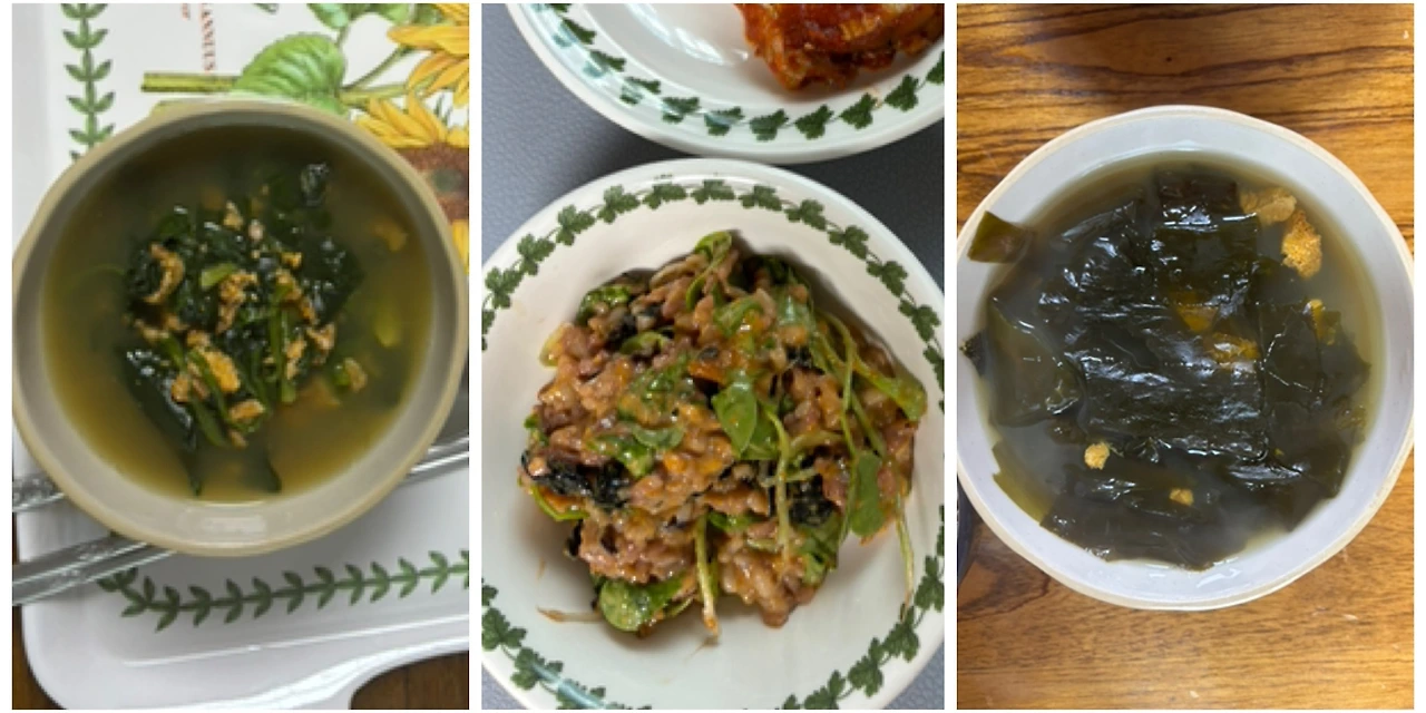 가장 왼쪽 사진은 해풍 맞은 시금치와 성게알을 넣어 만든 시금치 된장국이다. 금치는 비타민 A가 들어가 눈에 좋고 철분, 식이섬유가 풍부해 몸에도 좋은데 제주 시금치는 품질이 더 뛰어나다. 해풍 맞은 시금치가 뭐 그리 특별하냐고 생각할 수 있는데 남해지방에서 나는 시금치는 겨울 해풍을 맞으며 추운 기운에 살아남기 위해 체내의 전분을 당으로 변환시켜 단맛이 난다. 직접 먹어본 사람으로서 시금치를 원래 좋아하기도 하지만 '해풍 맞은 시금치'는 정말 더 맛있었다. 어머니는 시금치가 늦은 여름철까지 시금치를 먹기 위해 늦겨울이 되면 시금치를 얼려 저장해 놓으셨다. 이 해풍 맞은 시금치와 된장, 그리고 성게알을 듬뿍 넣으면 시금치 성게알 된장국이 된다.
