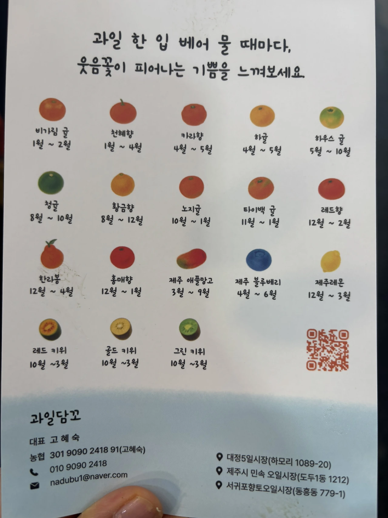 물론 일반적인 주황색 귤도 있다. 그리고 귤 종류가 매우 다양한 모양이다. 왼쪽 사진은 귤을 사기 위해 시장에서 받은 종이이다. 많이 사거나 선물을 하기 위해선 귤을 산다. 우리는 제주토박이가 아니라 귤밭이 없기 때문이다.
