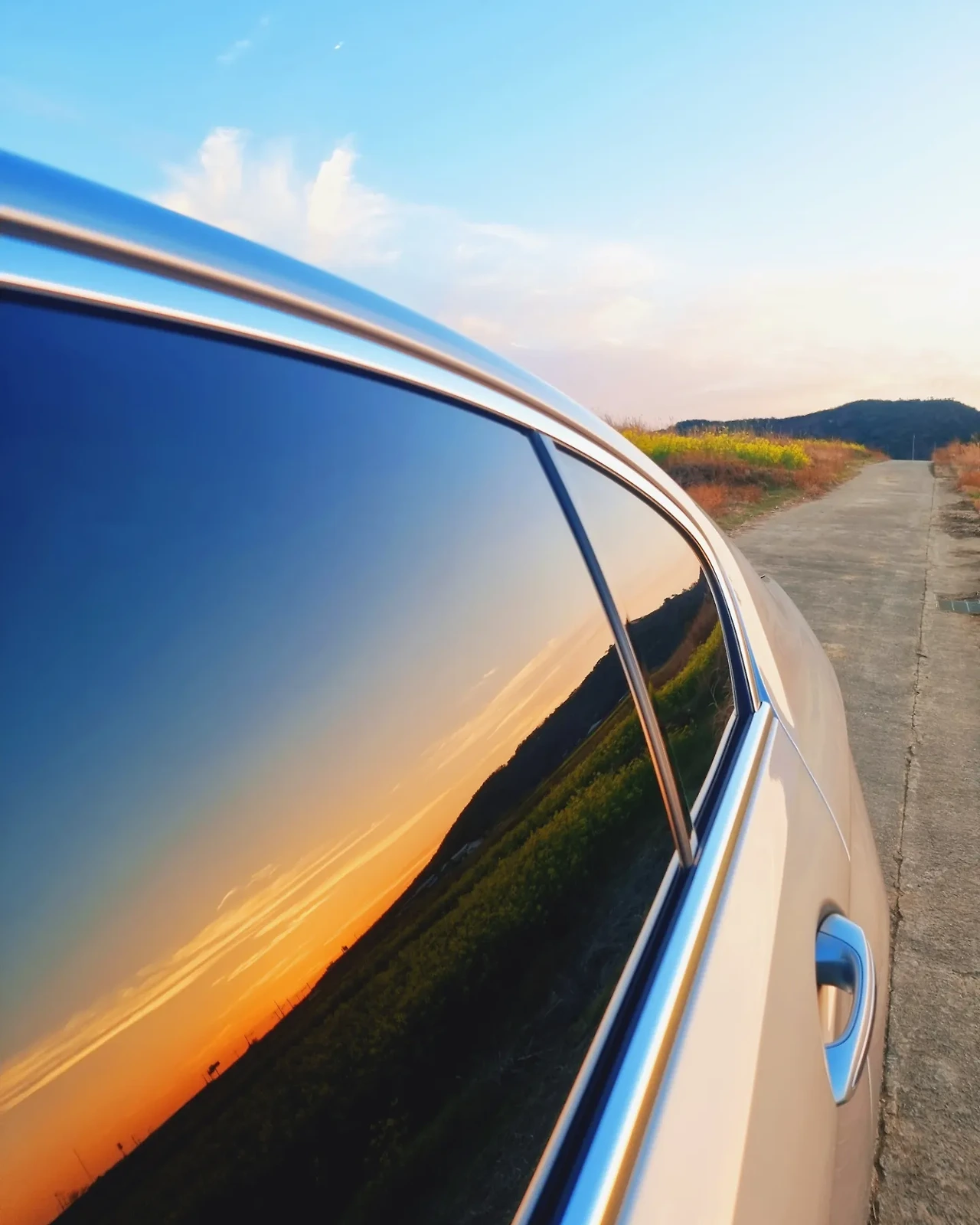 차량 뒷 창창문 비친 노을을 담은 사진 역시 사진 구도의 좋은 예라 할 수 있다. 또한 가장 우측의 노을 사진 역시 노을을 사진의 좌측, 중앙 또는 우측 중 어디에 두느냐에 따라 사진 느낌이 달라진다. 또한 유채꽃밭과 하늘의 비율을 사진처럼 5:5로 하느냐 아님 6:4 또는 4:6으로 하느냐에 따라 역시 사진 느낌은 많이 달라진다.