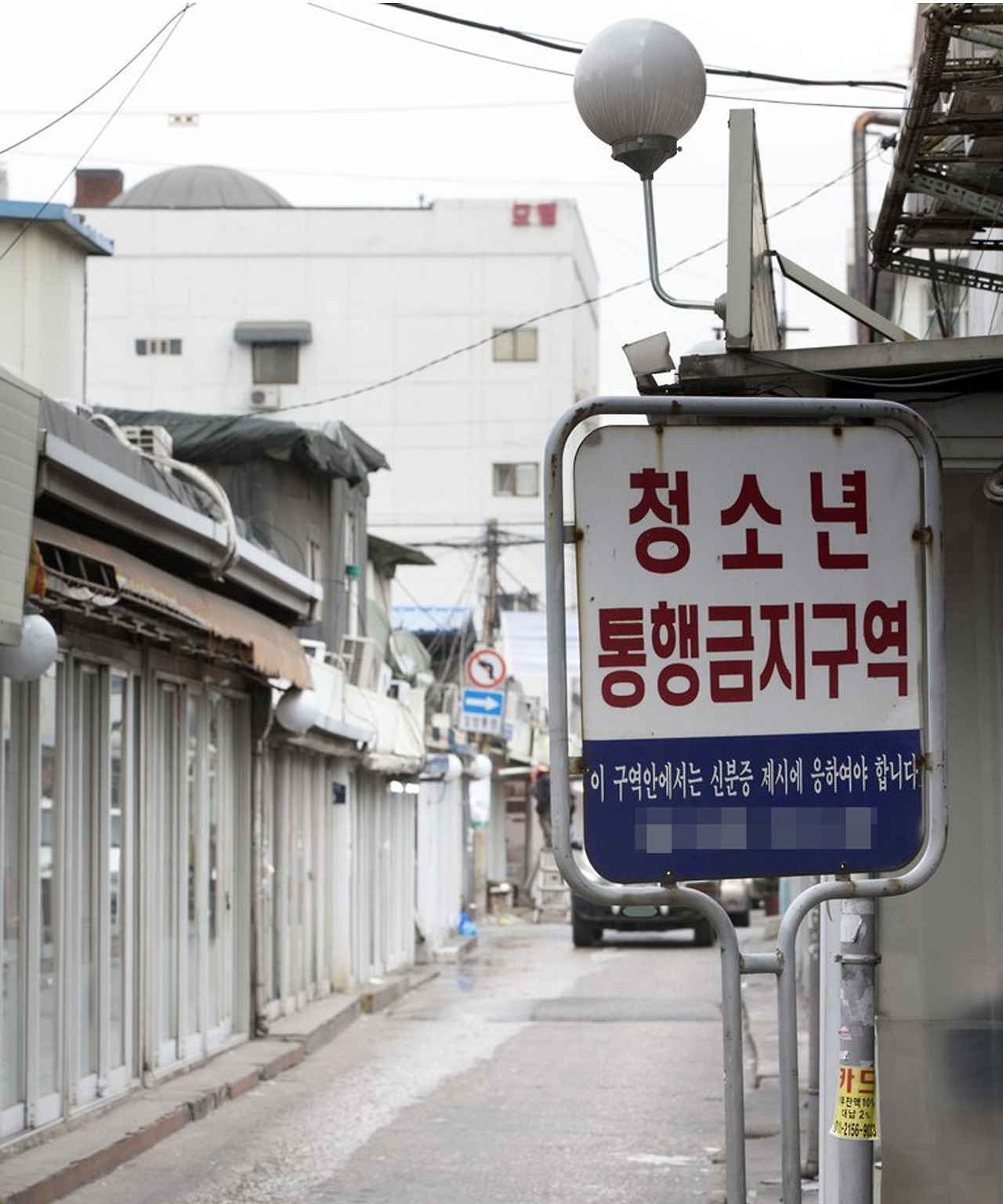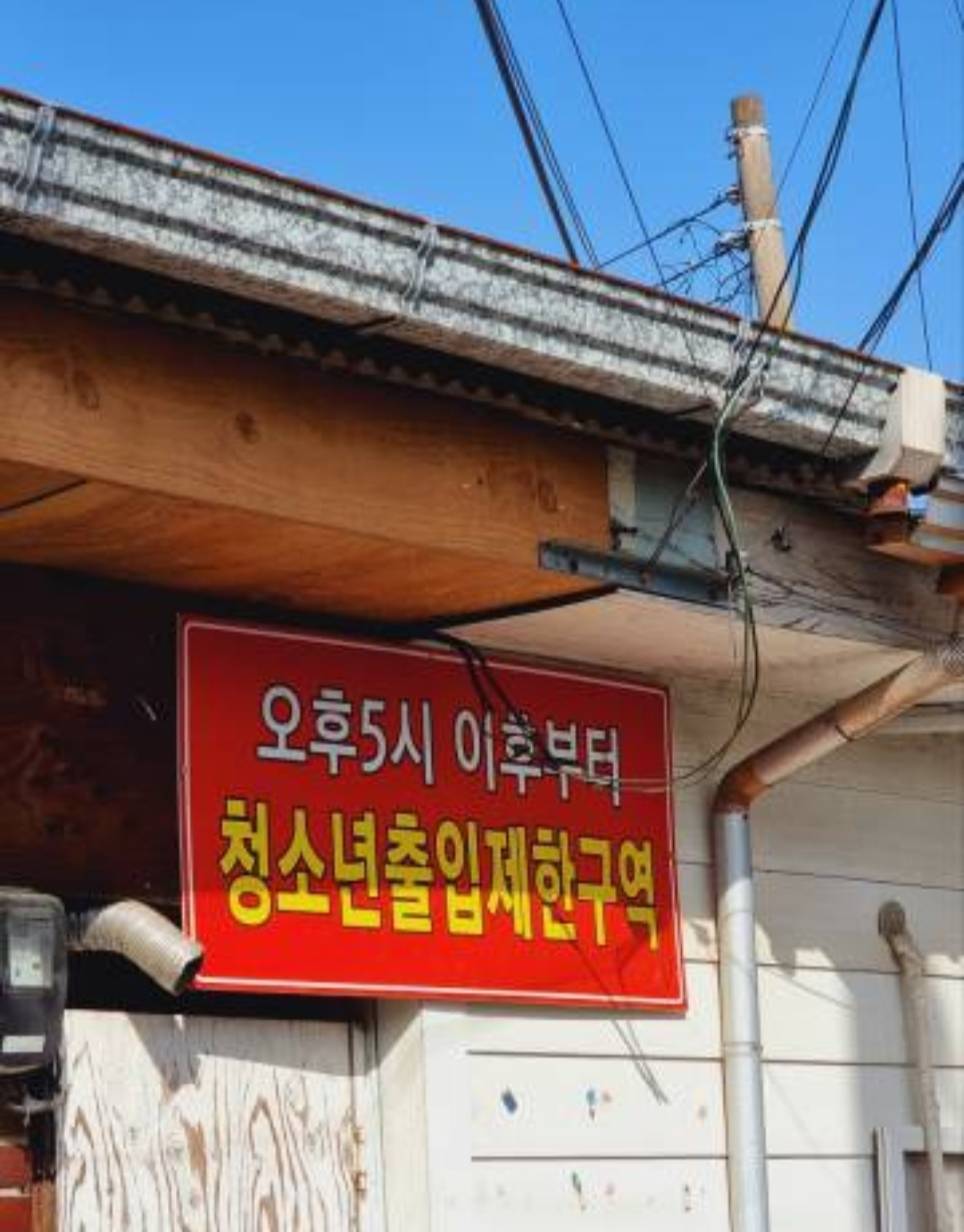 또한 골목 한쪽에는 빨간색으로 오후 5시 이후부터 청소년의 출입을 금지한다는 팻말이 붙어 있었다. 이는 관할 지자체나 경찰서에서도 이곳이 불법성매매가 이뤄지는 집창촌임을 알고 있다는 반증이기도 했다.