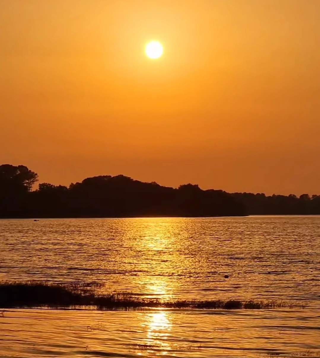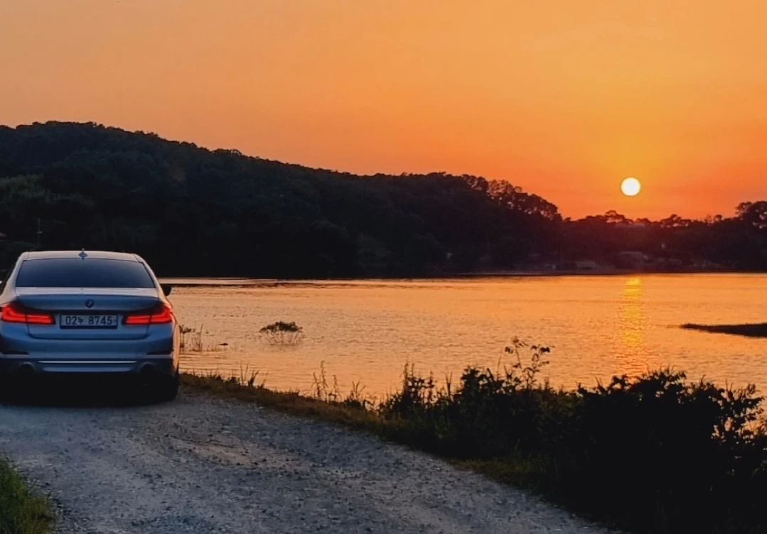 하루 일과를 마치고 퇴근 중인 태양의 붉은빛이 탑정호를 완전히 다른 모습으로 물들이는 시간. 저 멀리 탑정호 출렁다리의 모습도 보인다.