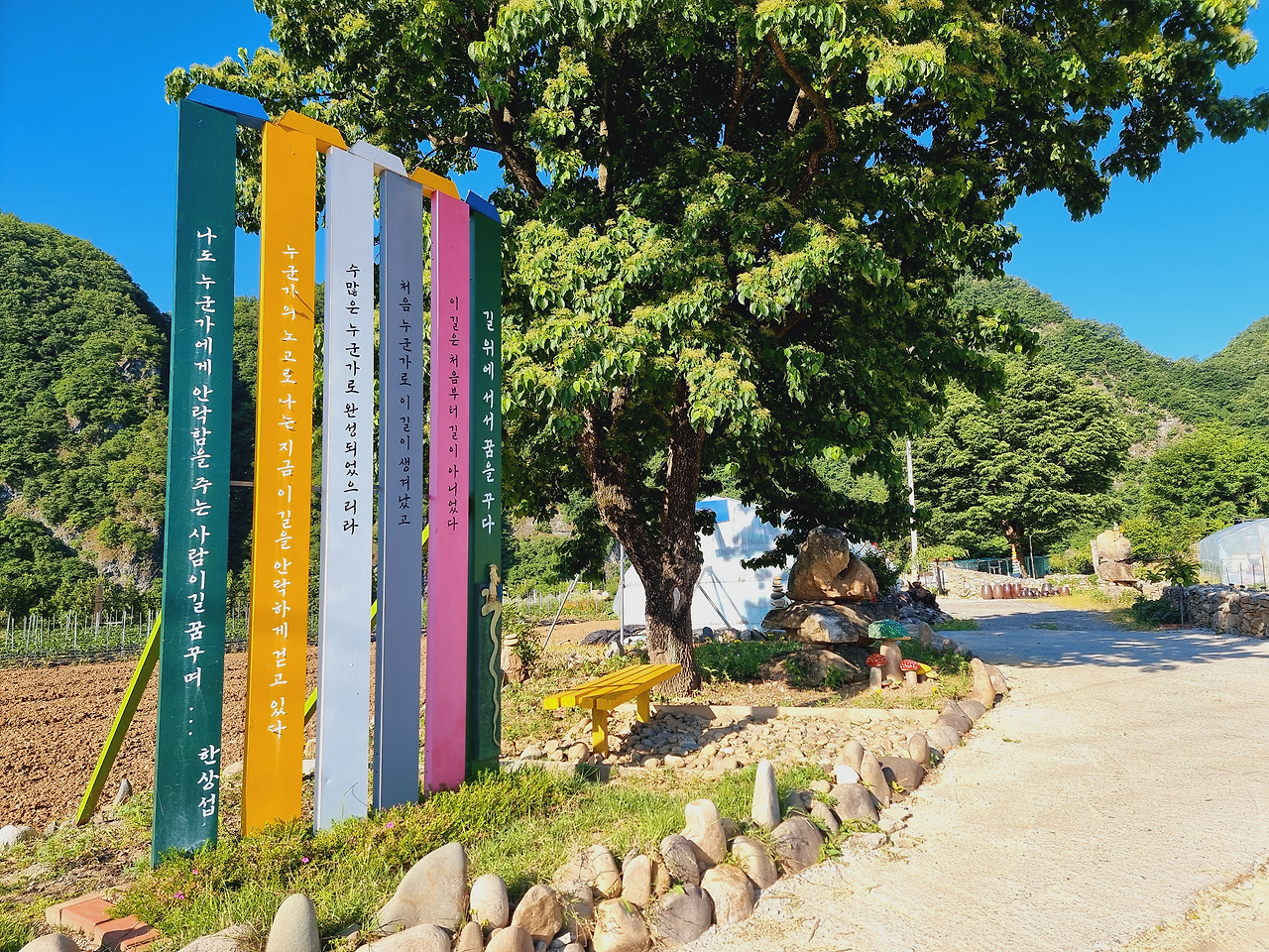 5. 청령포역을 지나 호젓한 마을길을 걷다보면 시의 글구가 적힌 형형색색의 조형물이 나온다. 인증사진을 찍는 구간이기도 하다.