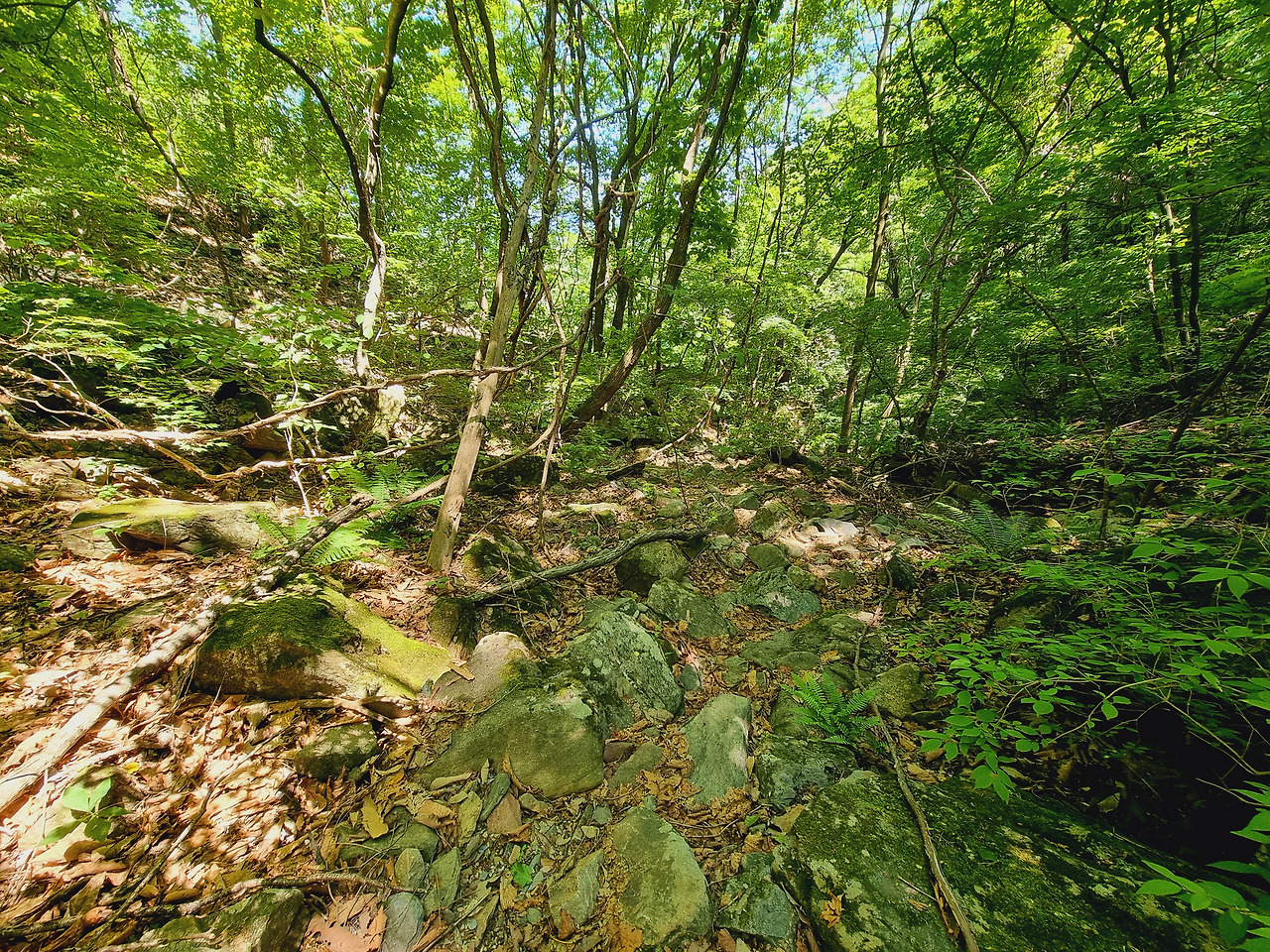 7. 1길의 가장 힘든 코스인 태화산 구간을 지나 거친 너덜바위들이 가득한 가파른 내리막길을 한참을 내려오면 다시 조망이 트인다.