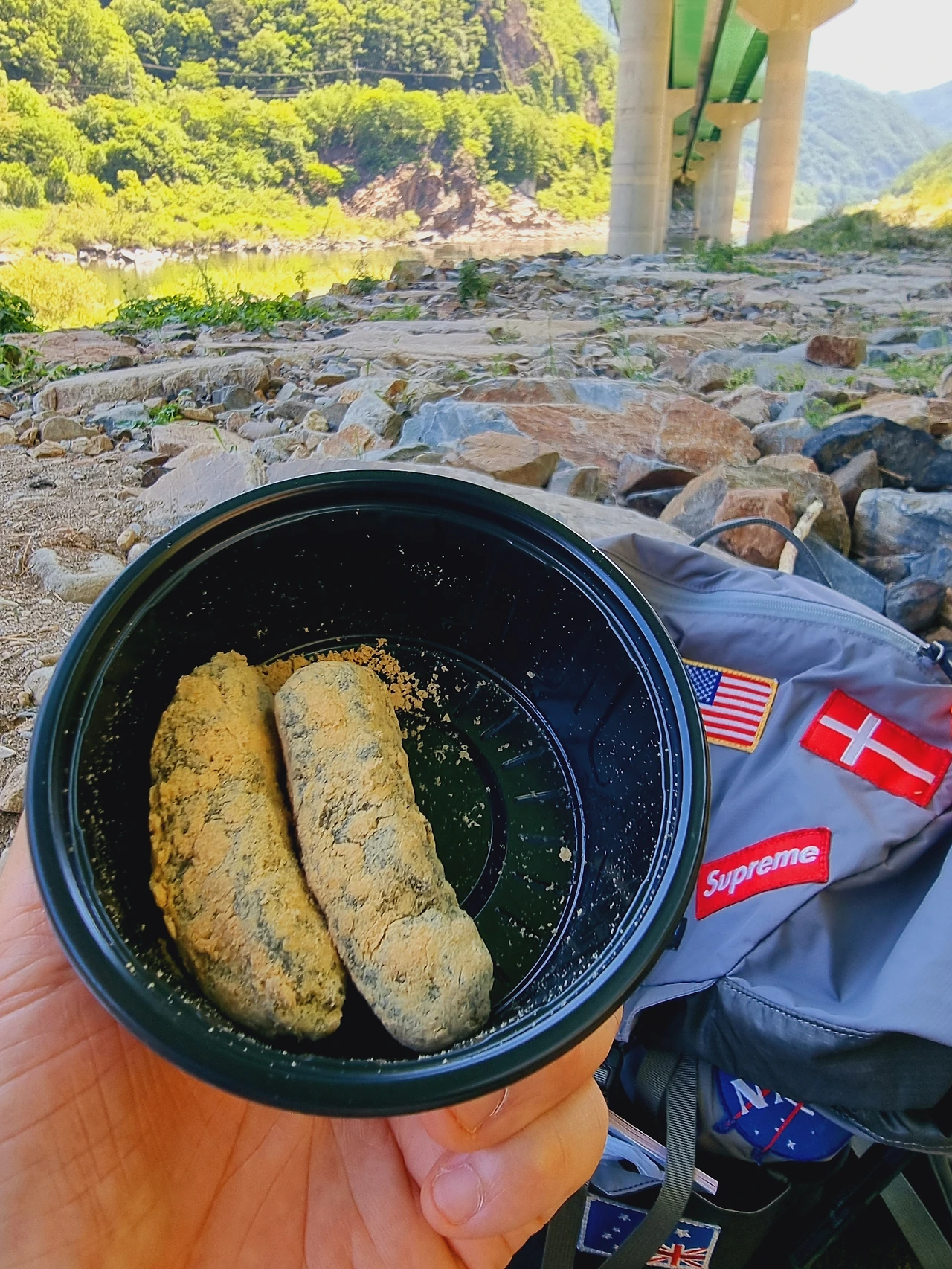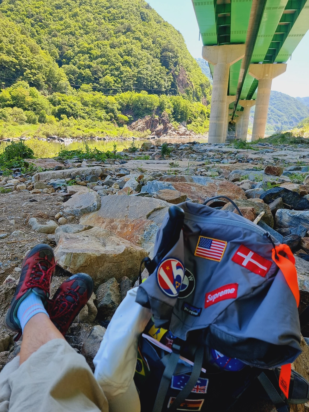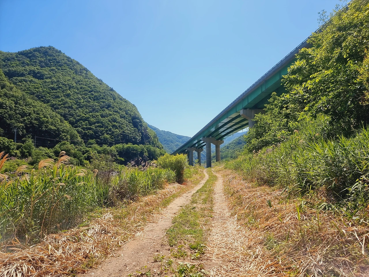 이제 땡볕의 아스팔트길을 계속 걸어간다. 20여분 정도 걷다 보면 좌측 건너편길 좌측 흙길로 빠지는 구간이 나온다. 팔괴리카누마을을 행해 다소 지루하고 덥고 힘든 트래킹을 이어간다. 넋 놓고 걷다 보면 좌측에 제법 큰 강이 하나 흐르고 머리 위로 고가 다리 하나가 나온다. 이 다리는 땡볕 트래킹에 지친 필자에게 그늘이라는 감사한 선물을 안겨준 그런 고마운 다리다. 이곳에서 허기진 배를 달래기 위해 삼각김밥 하나를 먹으면서 휴식을 취해본다.