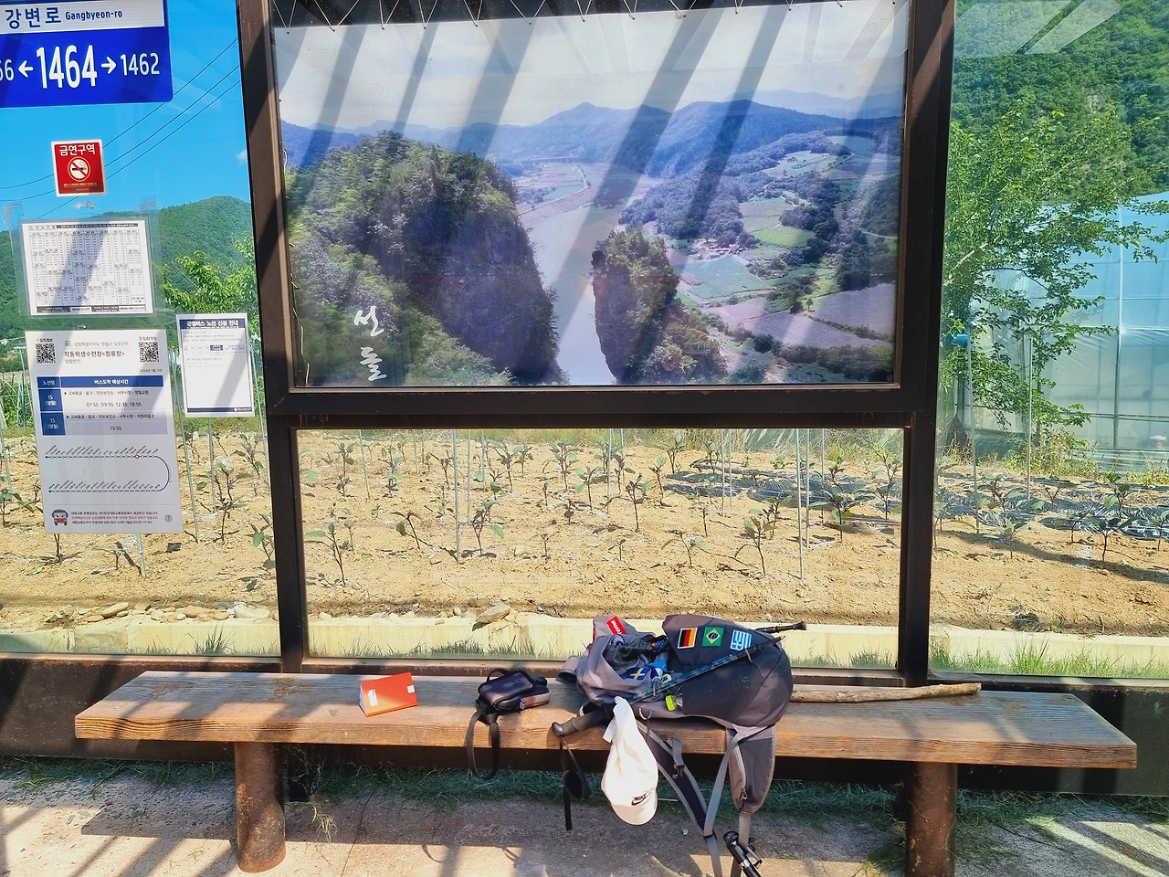 운탄고도 1길의 다소 험난했던 기억으로 인해 앞으로 겪게 될 남은 구간에 대한 작은 경계심을 갖고 다시 2길을 시작했다. 1길의 도착점이자 2길의 시작점인 ??? 정류소 주변에 차를 주차 후 2길을 시작했다. 2길을 시작하면 출발 후 다소 긴 구간을 그늘 없는 길을 오랫동안 걷게 된다. 역시나 땡볕의 아스팔트길은 쉽지 않은 구간이다. 그나마 우측에 보이는 강과 푸르고 울창한 산세의 풍경이 눈을 즐겁게 해 주니 다행이다.