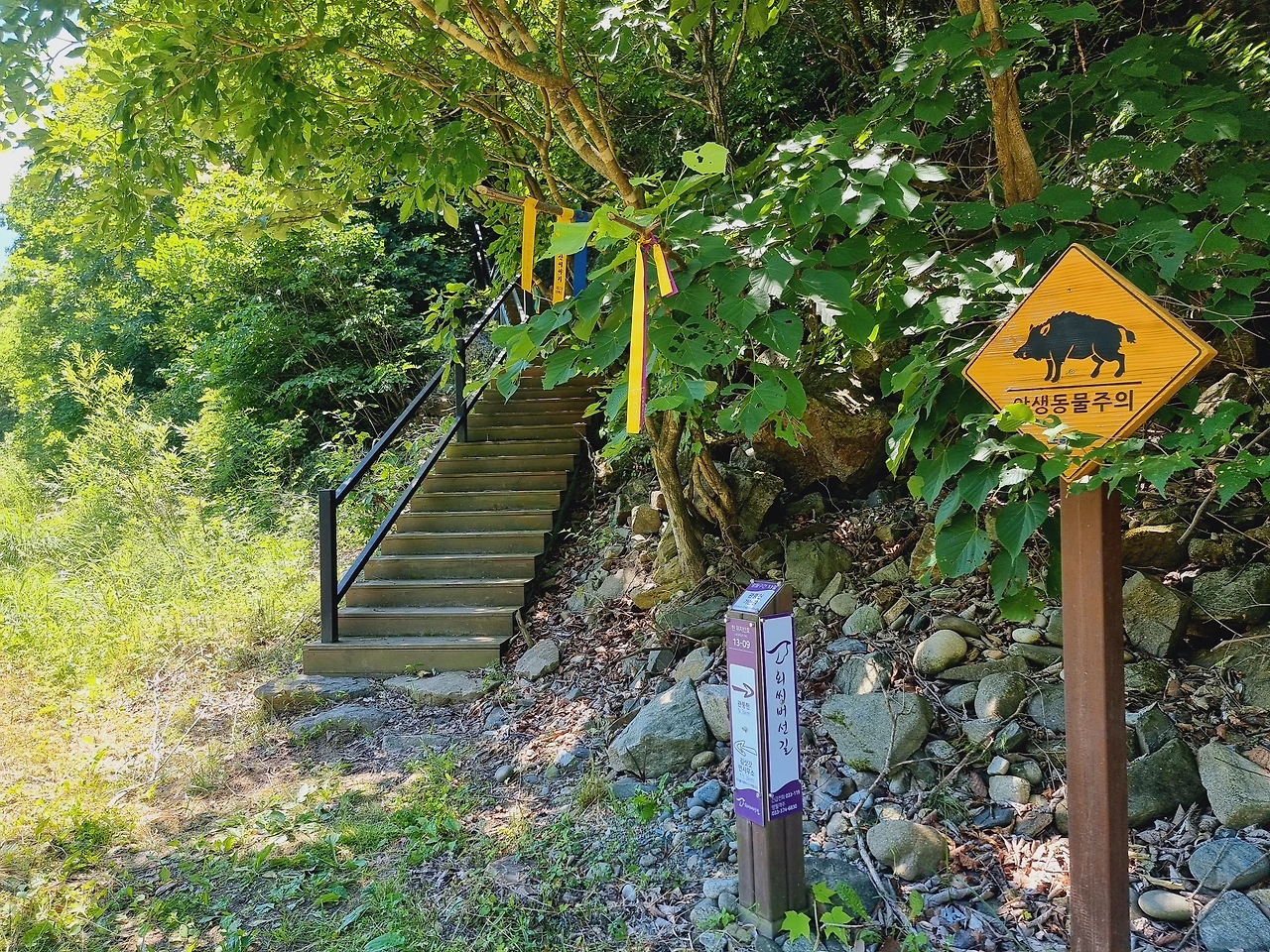 그런 점에서 생각해 보면 이 다리 밑에서 이렇게 삼각김밥을 먹으면서 노래도 흥얼거리는 등 나름대로의 자유로움을 만끽하는 것도 생각보다 재미있고 힐링이 된다. 주변에 산도 보이고 강도 있고, 뭐 이 정도면 훌륭하지 않은가. 짧은 휴식 후 강 옆을 따라 다시 이어진 길은 생각보다 길고 지루하게 느껴졌다. 그렇게 30분 이상을 걷다 보면 우측 방향으로 산속으로 진입하게 된다.