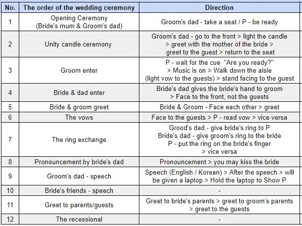 결혼식 1-2주 전이 제일 바빴던 것 같다. 사회자 대본은 친구와 지인에게 받은 사회자 대본을 우리에 맞게 수정해서 준비했다. 한국어를 못하는 신랑과 아버님을 위해 식순지, 동작 부연 설명지(?)를 영어로 만들었고, 사회자 대본에 추가로 영어 지시문도 추가했다. 아버님이 쓴 축사는 사회자의 동시통역을 위해 한국어로 번역을 했다. 반면, 우리 아빠가 쓴 덕담 겸 성혼선언문 동시통역까지는 진행하지 않았고 신랑과 아버님을 위해 번역본을 지면으로 준비했다.
