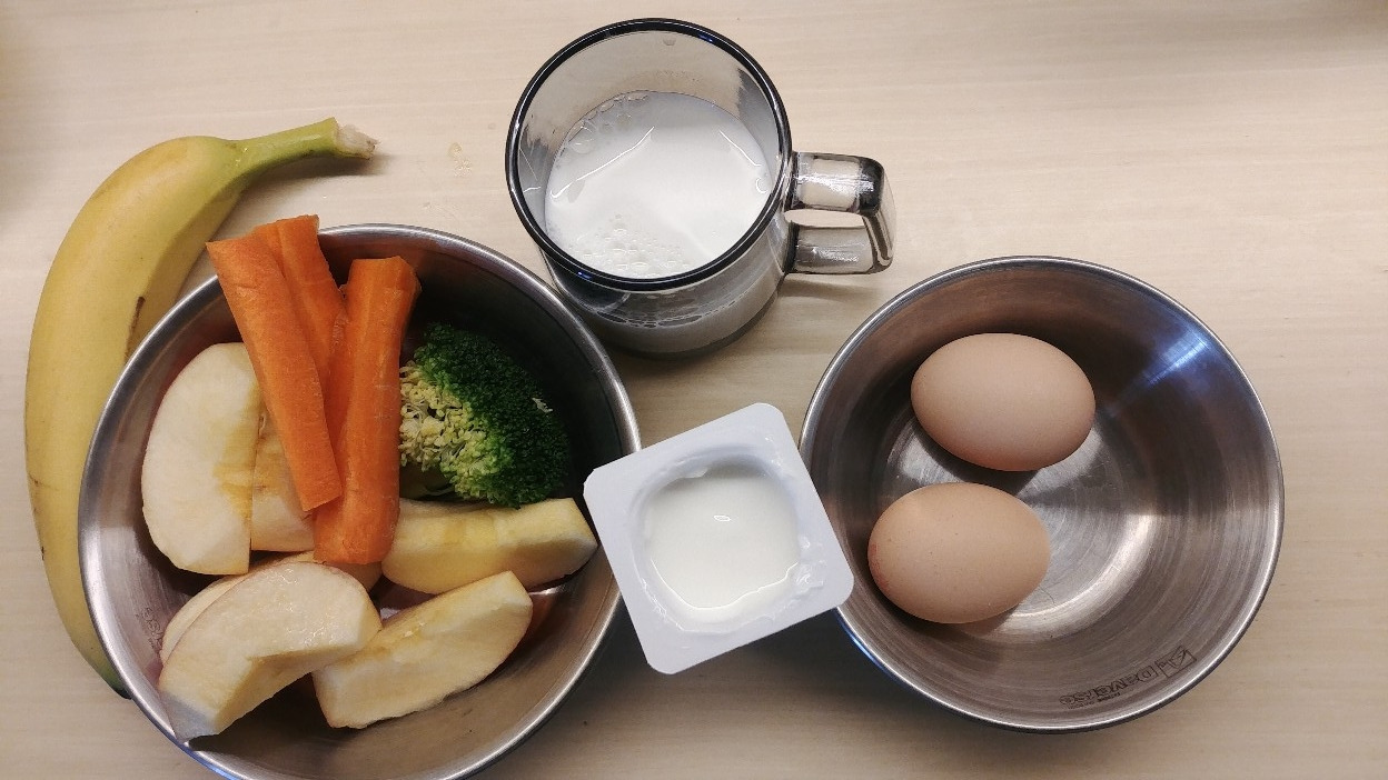 점심은 파우더 단백질, 요거드, 바나나, 당근, 우유를 넣고 휴대용 믹서기로 갈아서 점심을 먹고 있다.
