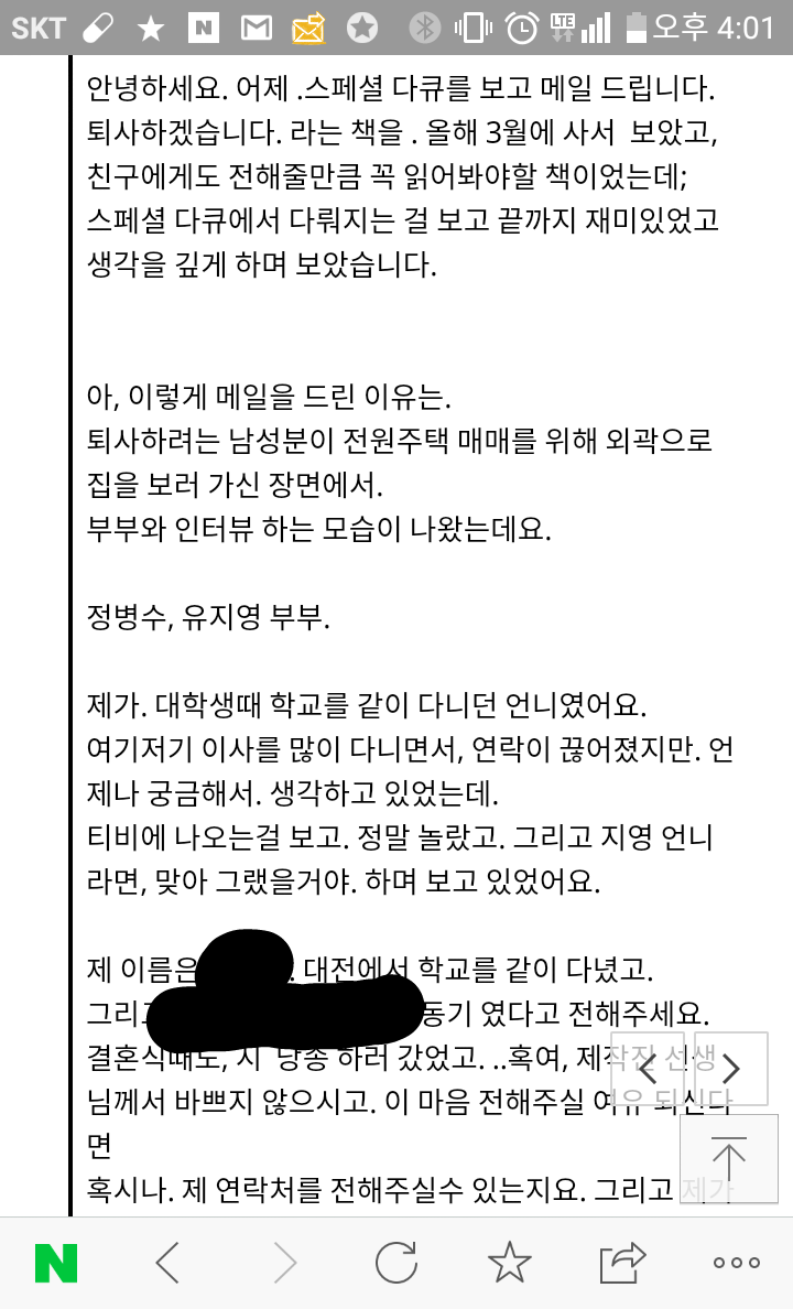 메일을 확인해보니, 오래전 아내와 친하게 지냈던 동생입니다. 주례 없는 결혼식으로 허전했던 부분을 아름다운 시 낭송으로 이 친구가 채워주었습니다. 연락이 끊겨 궁금해하던 차에, TV를 통해 이산가족 상봉하듯이 오래전 인연과 재회하게 됩니다.