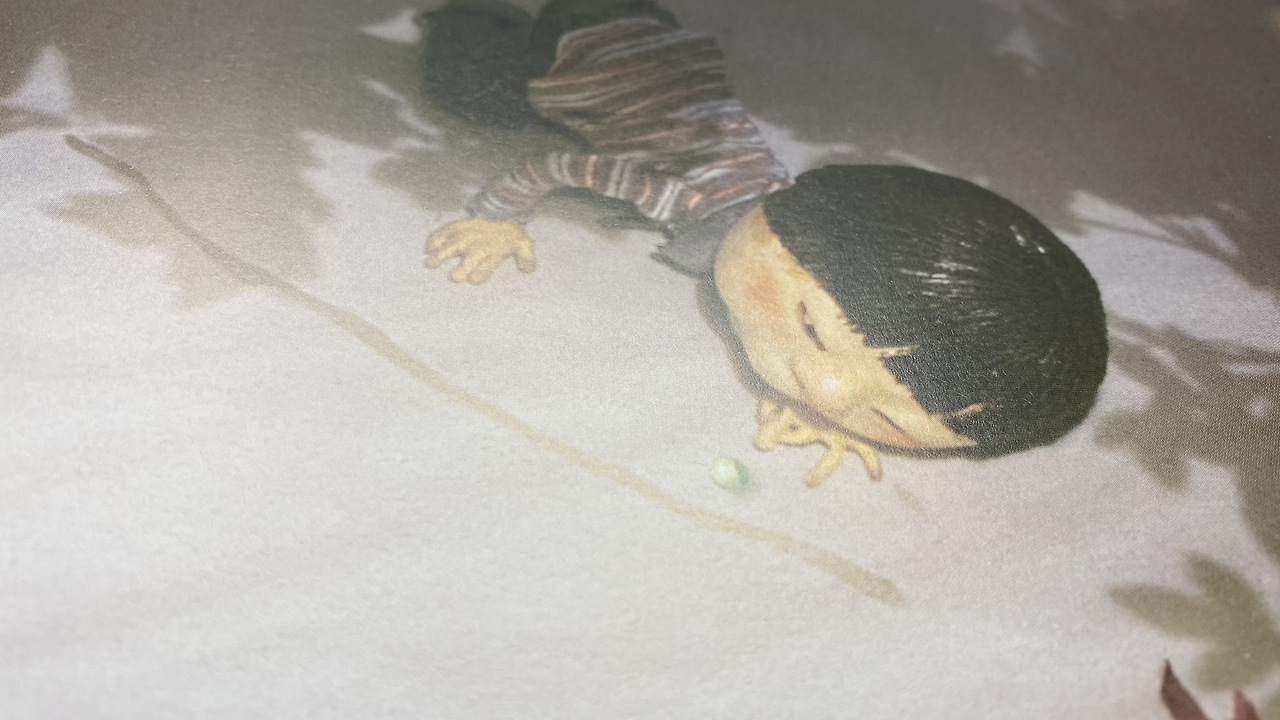 구슬치기를 하고 싶은 모양인데 친구들이 놀아주지 않습니다. 그래서 그냥 혼자 놀기로 합니다. 혼자 놀기도 재미있다고 말해 보지만 사실은 아닐 테죠.