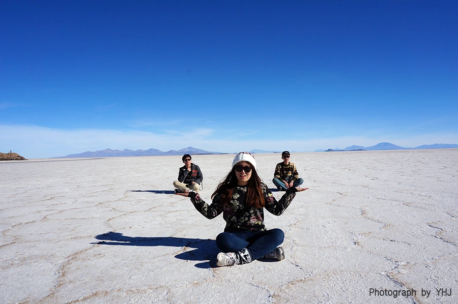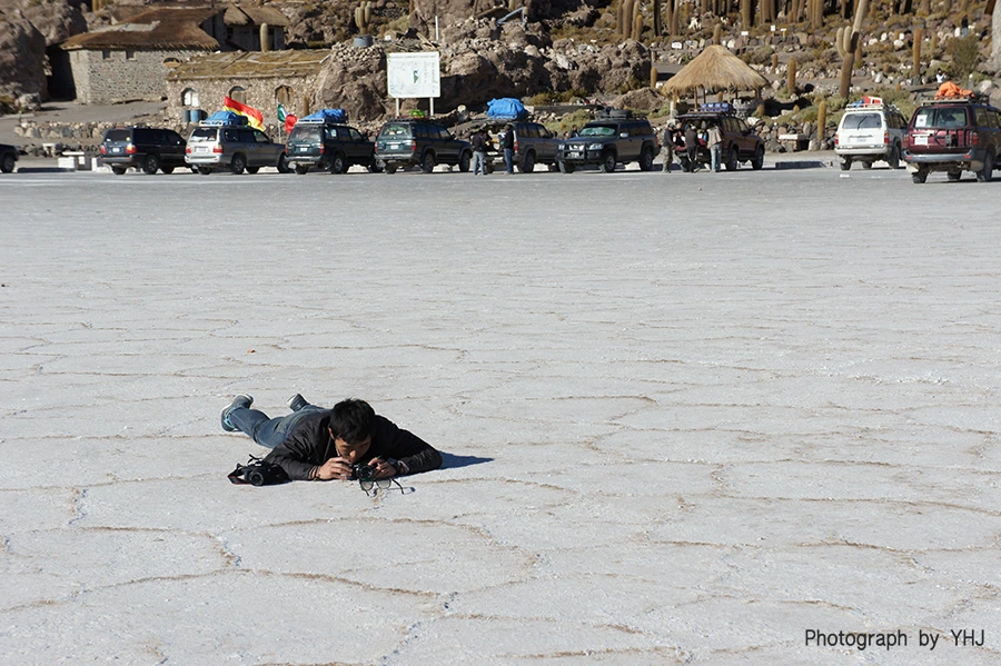 그 시간동안 열심히 사진을 찍기로 했다. 일상에 있었다면 왜 저렇게 누워서까지 사진을 찍나 싶겠지만 이 곳은 일상이 아닌고로, 마치 환상 속에 온 것 같았다. 발바닥으로 느껴지는 마른 소금이 끝없이 펼쳐지는 이 사막은 다른 세상이라면 다른 세상.