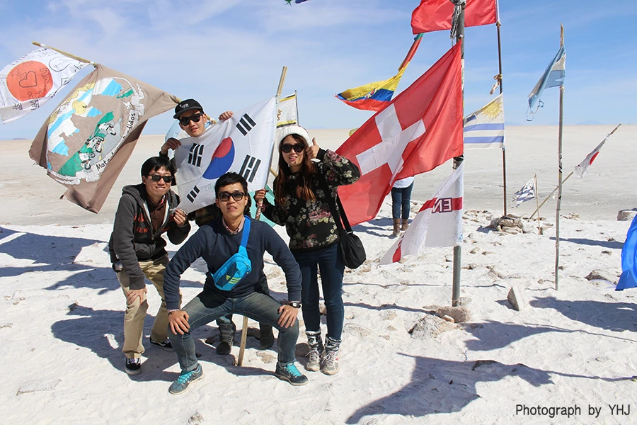 지옥의 랠리라는 별명이 붙은 '다카르 랠리'가 2014년에 볼리비아 코스를 추가함으로써 설치해놓은 포토존 및 홍보물들을 볼 수 있었다. 그 주변에 세계 각국에서 온 사람들을 보여주는 세계 국기들이 걸려있는 곳도 지났다. 평소에는 별 생각없었지만 여기서는 한국인들이 함께 태극기로 모여 사진을 찍었다. 볼리비아에서의 6월은 겨울이라 기온 자체는 낮았지만 낮에는 사막 특성상 그늘이 없고 해가 쩅쨍해서 견딜만 했다. 그리고 하얀 소금알갱이들을 사박사박 걷는 느낌이 꽤 좋았다.
