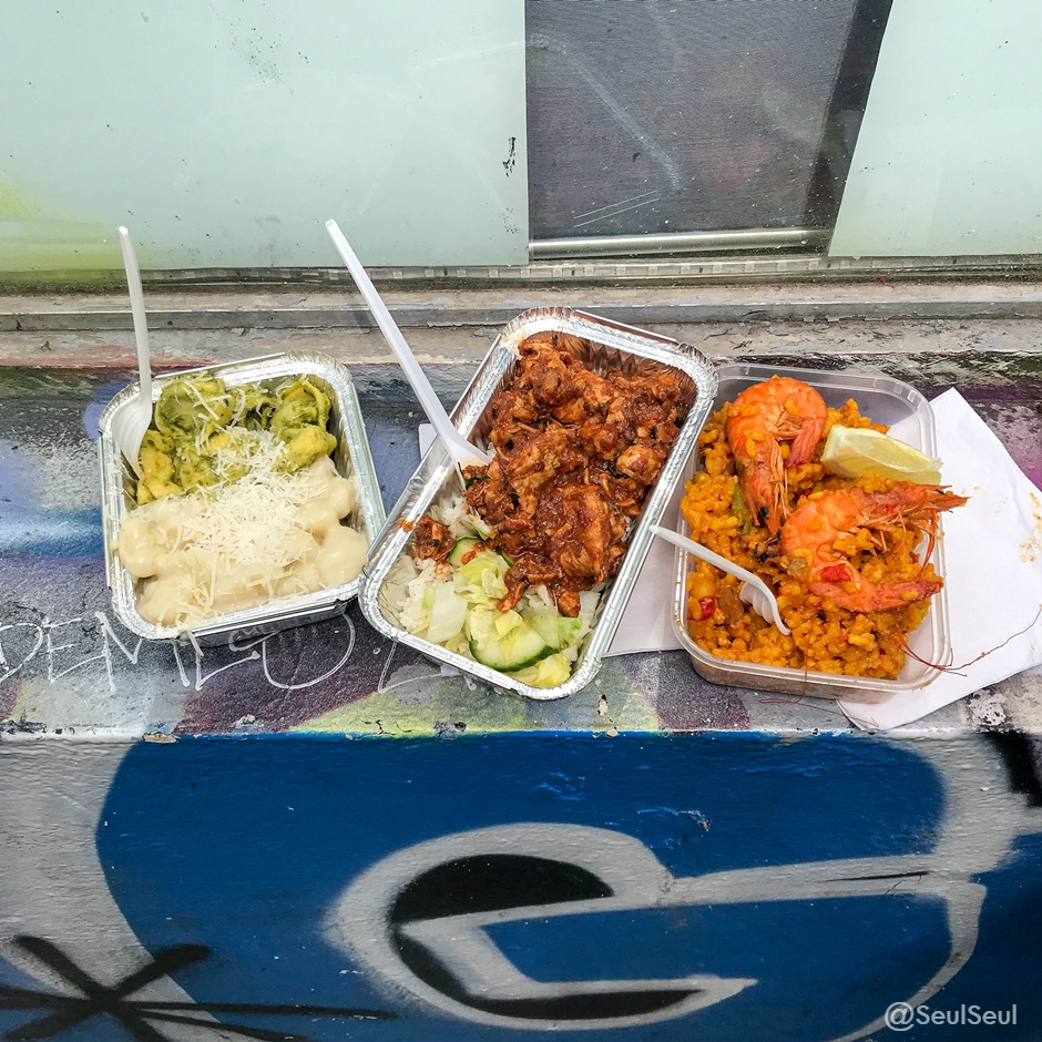 마켓에서 간단하게 식사를 먹는 것도 방법이다. 그도 그럴 것이 스낵 종류만 파는 것이 아니라 정식으로 식사메뉴를 많이 팔고 있기 때문에 한번 쓰윽 둘러보면 맛있는 것들이 많다. 여기가 대체 어딘가 싶을 정도로 다양한 나라의 음식을 팔고 있다. 거대한 팟에서 바로 익혀서 나온 파스타와 커리, 빠에야를 한 번에 먹어볼 수 있는 곳이라니.