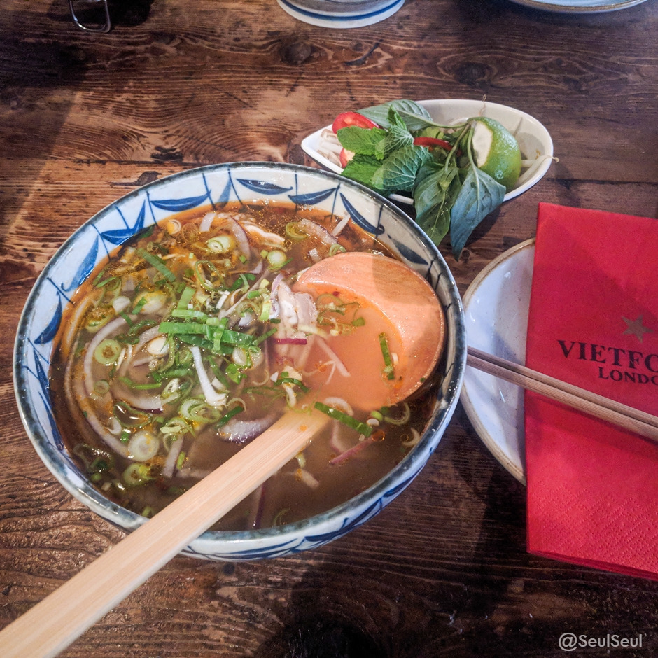 영국이 쌀국수도 잘한다더라!(?)해서 방문한 곳이다. 쌀국수와 반세오를 시켰는데 쌀국수 국물이 꽤 괜찮았다. 반세오는 현지와는 다르게 조금 퓨전으로 나왔다. 넓은 튀긴 전병과 아래 야채를 곁들여 먹으면 된다.방문했던 날은 날씨가 꽤 쌀쌀했는데 따뜻한 국물이 제격이었다. 런던 차이나 타운 안에 있다.