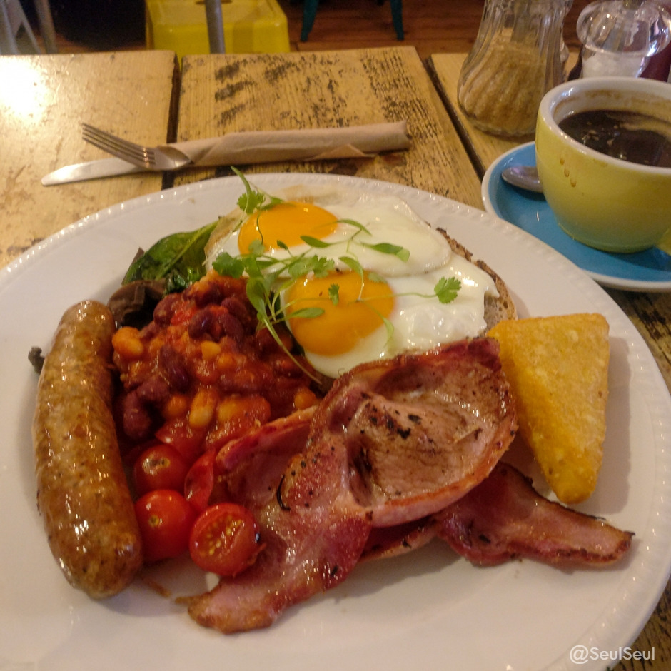 해머스미스역에서 조금만 나와 걸으면 아침인데도 사람이 바글바글한 트루스 카페를 볼 수 있다. 구글 지도로 찾아보니 평점이 꽤 높았고 브런치를 많이 먹으러 오는 것을 알 수 있었다. 영국의 전통 식사라는 잉글리시 브랙퍼스트(English Breakfast)를 계속 먹어보고 싶었는데 좋은 기회였다. 달걀, 베이컨, 소시지, 버섯, 블랙푸딩, 토마토 등으로 구성된 푸짐한 식사다. 덕분에 아침을 든든하게 챙기고 시작할 수 있었다.