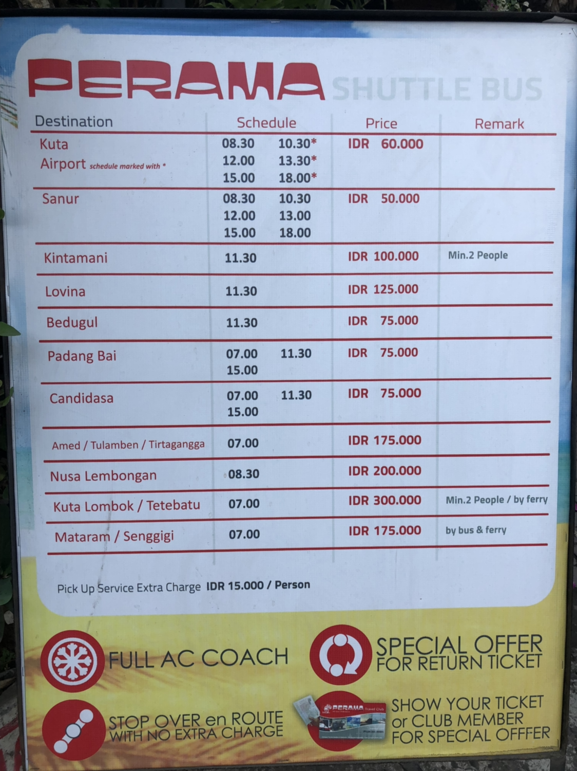 우붓에서 꾸따로 가는 교통편은 Perama 셔틀버스를 이용했다. 발리의 주요 지역마다 Perama 여행사가 있는데, 그 여행사들 간에 운영하는 버스가 있다. 우붓으로 올 때는 이런 게 있는지 몰라서 택시를 타고 왔지만, 60K면 우붓-꾸따를 편도로 이동할 수 있다. 시간도 하루에 여러 시간대가 있는데, 나는 10:30 버스를 타고 가기로 했다. 참고로, 우붓에서 꾸따뿐만 아니라 사누르, 렘봉안, 킨타마니, 빠당 바이 등 다른 지역도 갈 수 있다.