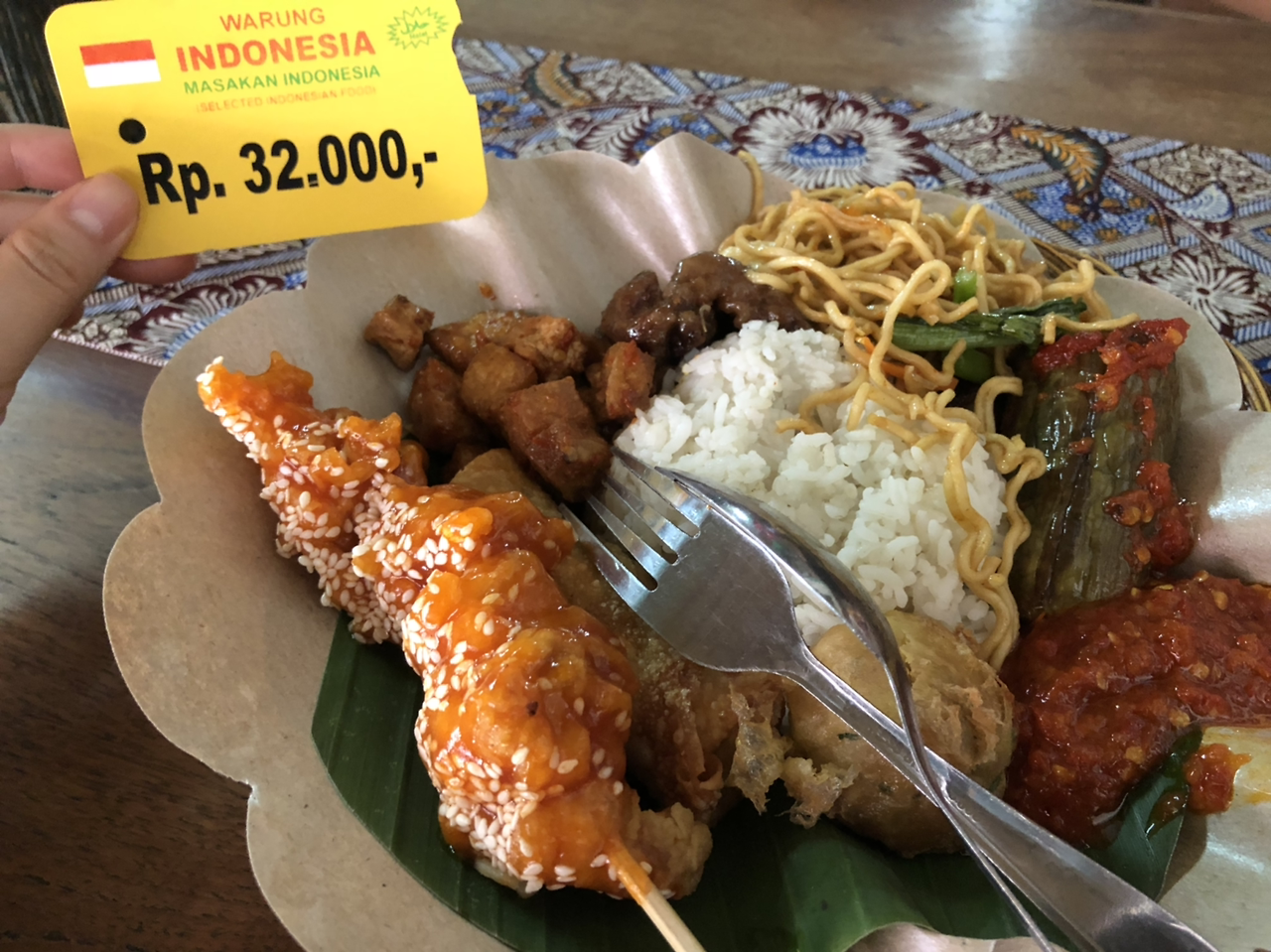 첫 번째 먹은 음식은 나시 짬뿌르. 구글 맵스에서 근처 식당 중 별점이 높은 집을 찾아갔는데, 반찬을 보고 맘대로 고를 수 있어서 편했다. 반찬마다 가격이 달라서 다 고른 후 책정되는 시스템. 가격은 2천 원 후반대로 엄청 저렴했고, 여기서 먹은 망고 주스는 최고였다.