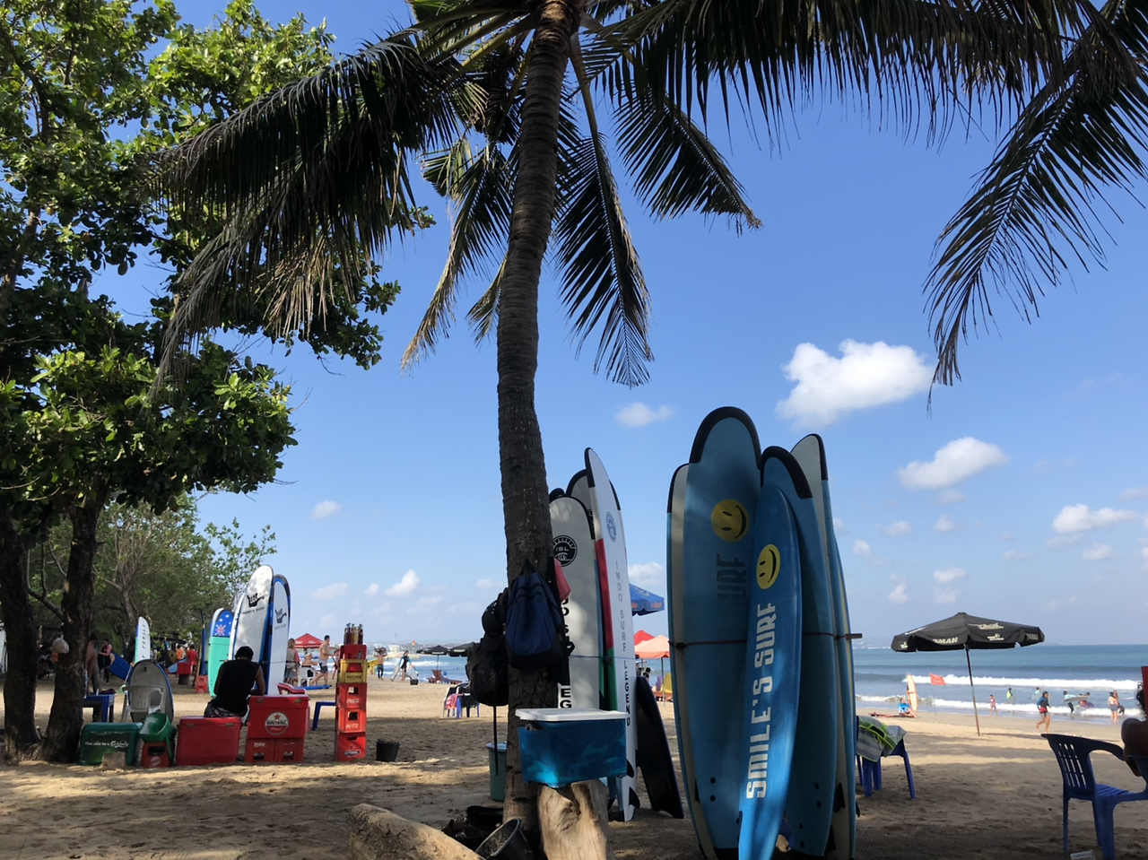 발리에 온 가장 큰 목적인 서핑을 하기 위해 꾸따 비치로 향했다. 마침 친한 언니가 바로 전 주에 서핑하러 발리를 다녀왔기에, 언니가 소개해준 서핑 강사에게 강습을 예약했다. 꾸따 비치 근처에는 서핑 스쿨이 엄청나게 많아서 미리 예약하지 않고 현지에서 바로 예약해도 괜찮다고 한다. 호텔에서 해변으로 나가는 길에 한국인이 운영하는 서핑 스쿨도 있었다.