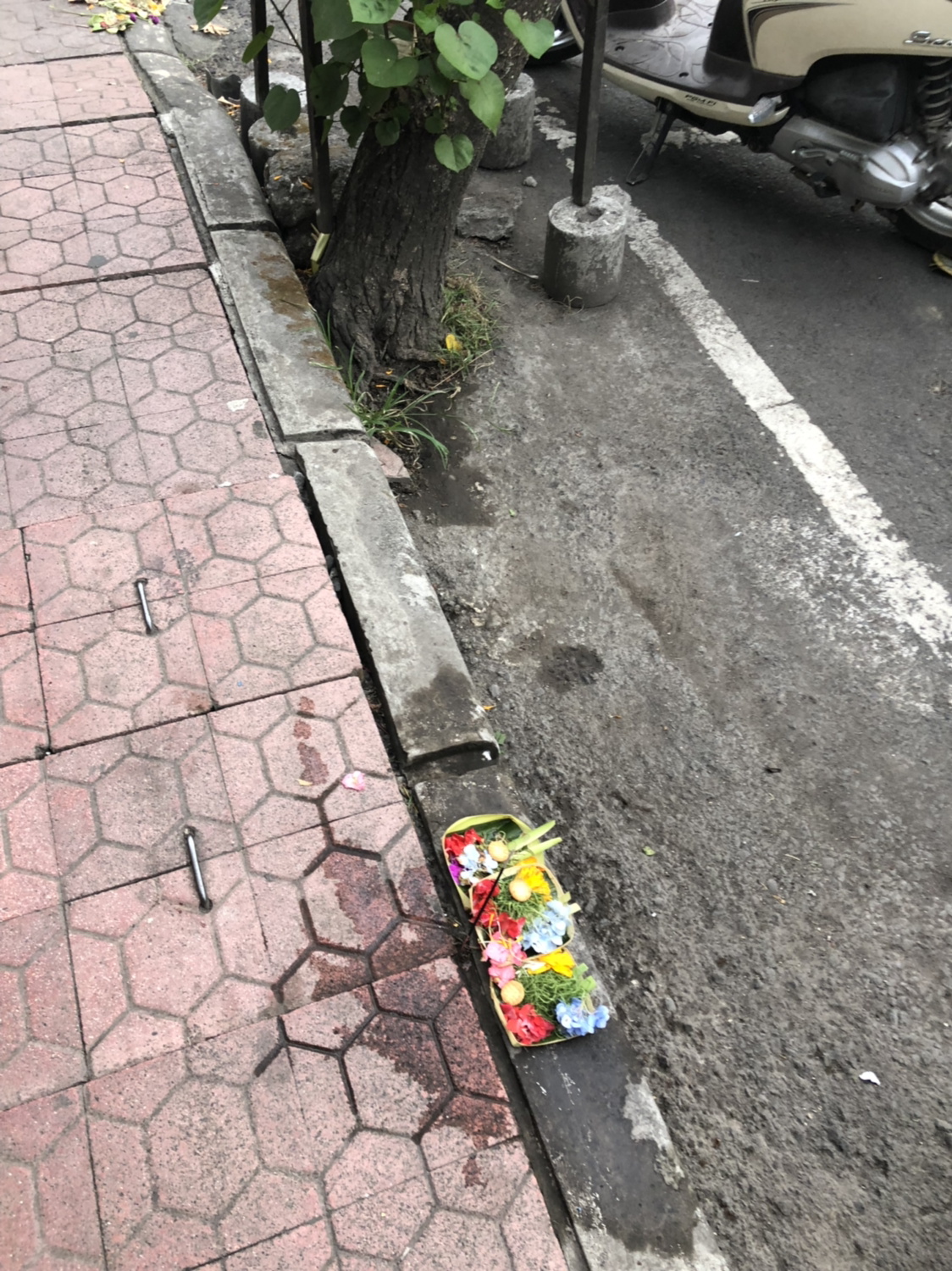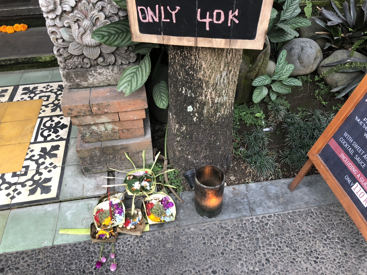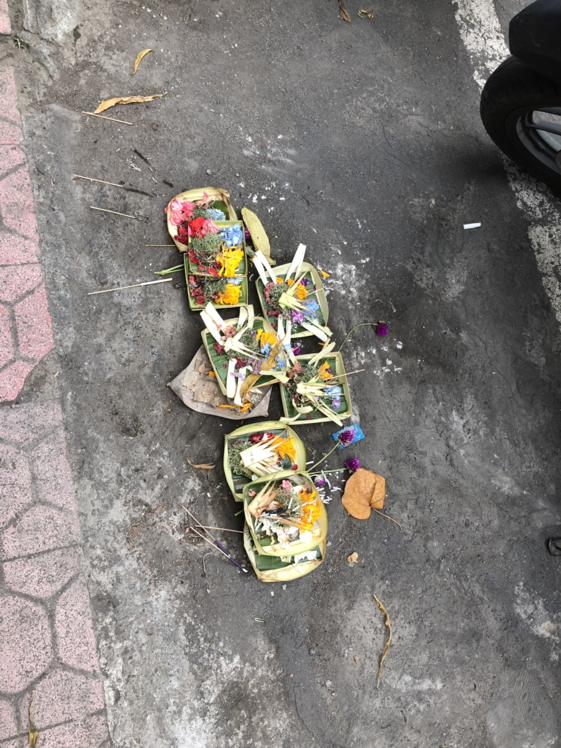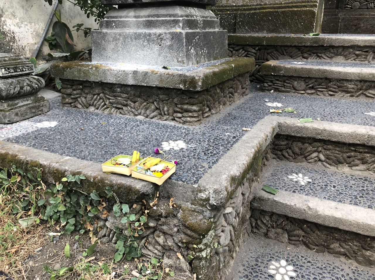 또한 발리를 돌아다니다 보면 어디서나 길바닥에 놓인 공물들을 볼 수 있는데, 처음엔 이 걸 볼 때마다 너무 신기했다. 현지인들에게 물어보니 신에게 바치는 공물이라고 하며, 나뭇잎으로 만든 작은 그릇에다가 7가지 다른 공물을 바친다고 한다. 주로 향, 꽃잎(여러 종류), 물, 과자, 동전 등으로 구성되어 있고, 모두 조금씩 다른 걸로 보아 종류가 정해져 있지는 않은 모양이다. 하루에 세 번 혹은 그보다 많이 바친다고 한다. 그런데 길거리에 사람과 차들이 지나다니는 길에 공물 그릇을 놓다 보니, 아무렇게나 엎어지고 짓밟힌 공물 그릇도 많이 보였다. 보통 신에게 바치는 공물이라고 하면 엎어지면 큰일 날 것 같은데 아닌 모양이다. 엎어진 흔적이 있는 곳 위에 또 새로운 공물을 바치는 걸 보니.
