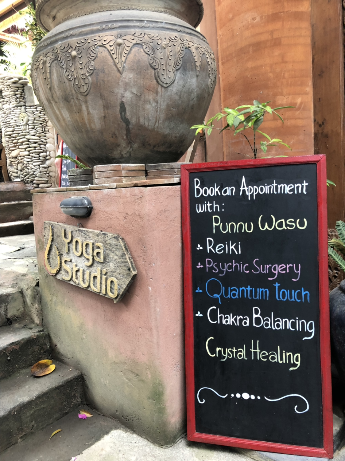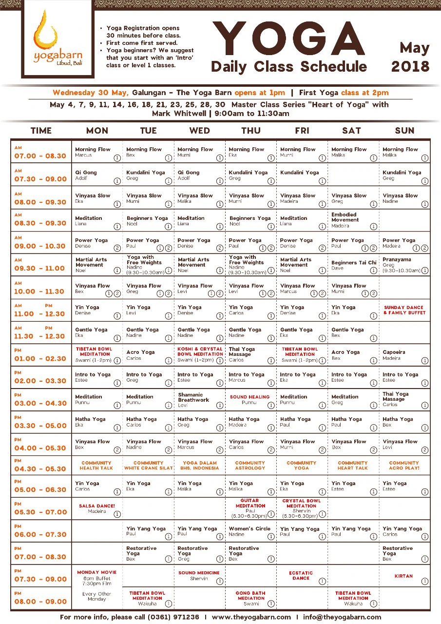 요가 반은 우붓 삼거리(내 맘대로 붙여서 부르는 이름) 근처에 위치하고 있는데, 코코 마트와도 가깝다. 골목으로 좀 들어가야 하며, 큰 길가부터 표지판으로 안내가 되어 있어서 찾기 쉽다. 리셉션에 가면 직원들이 친절하게 안내를 해준다. 요가 반은 여러 종류의 멤버십 카드를 팔고 있는데, 1회권은 150K이고 회수가 늘어날수록 조금씩 디스카운트를 해줬다. 한 달 무제한 멤버십은 20만 원 정도 했던 것으로 한국에 비하면 비싼 가격이었다. 나는 3회권을 끊어서 요가 클래스를 들어보기로 했다. 시간표에는 정말 많은 종류의 요가가 있었다. 거의 매 시간마다 수업이 있는데, 생소한 요가도 많이 있었다. 요가뿐만 아니라 명상이나 댄스 태극권 같은 것도 시간표에 있다.
