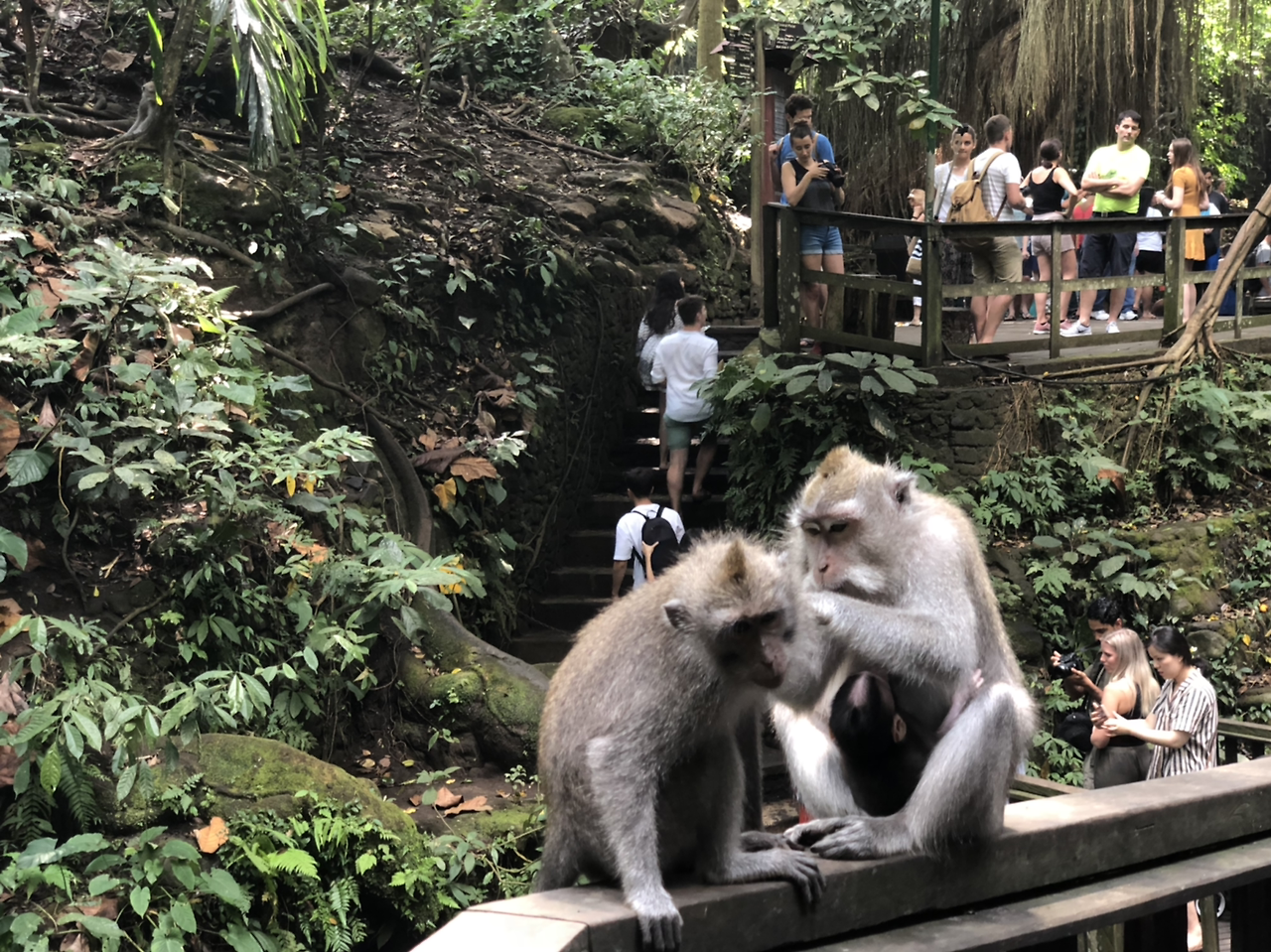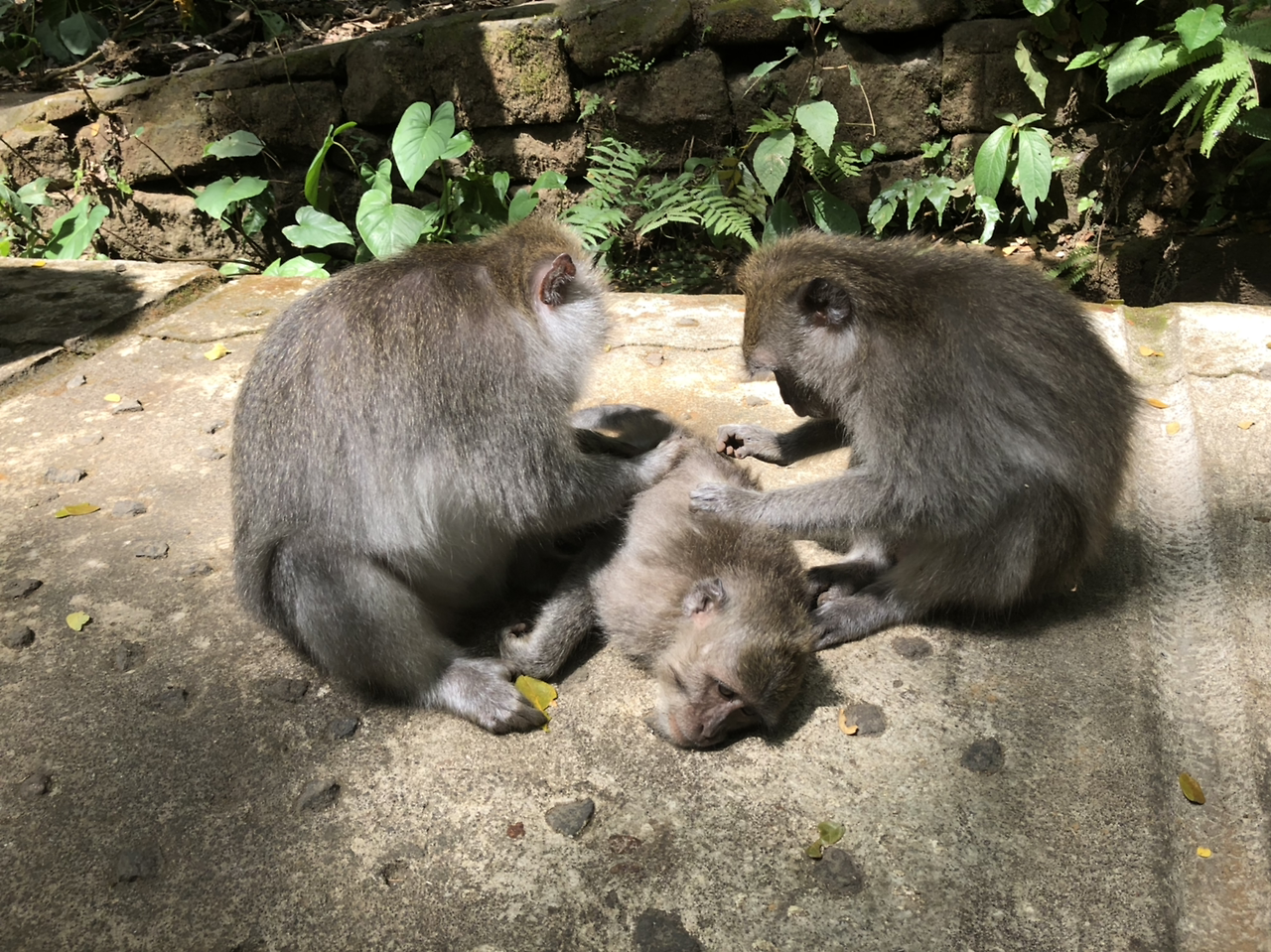 사건 사고만 쓰고 있어서, 몽키 포레스트가 위험한 곳이라고 생각될 수도 있는데, 그 외 대부분의 원숭이들은 대부분 온순하게 누워서 서로의 털을 정성스레 골라주고 있었다. 마치 원숭이 SPA에 구경 온듯한 느낌이랄까. 원숭이들이 서로 털을 골라주는 것은 친밀감 표시인 동시에, 염분 섭취를 위한 행동이라고 한다. 털을 골라주다가 뭔가 입에 집어넣는 걸 볼 수 있는데, 이 것은 대부분 이가 아니라 비듬이라고 한다.