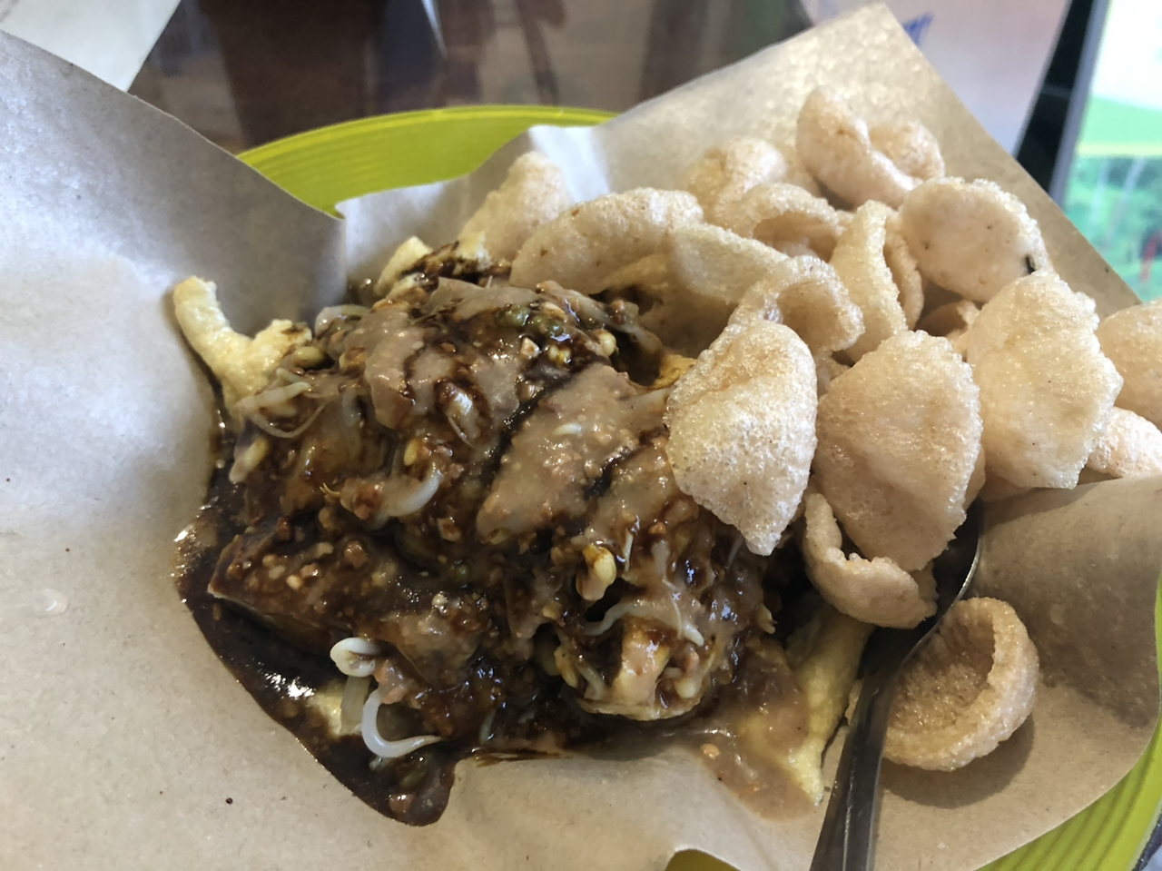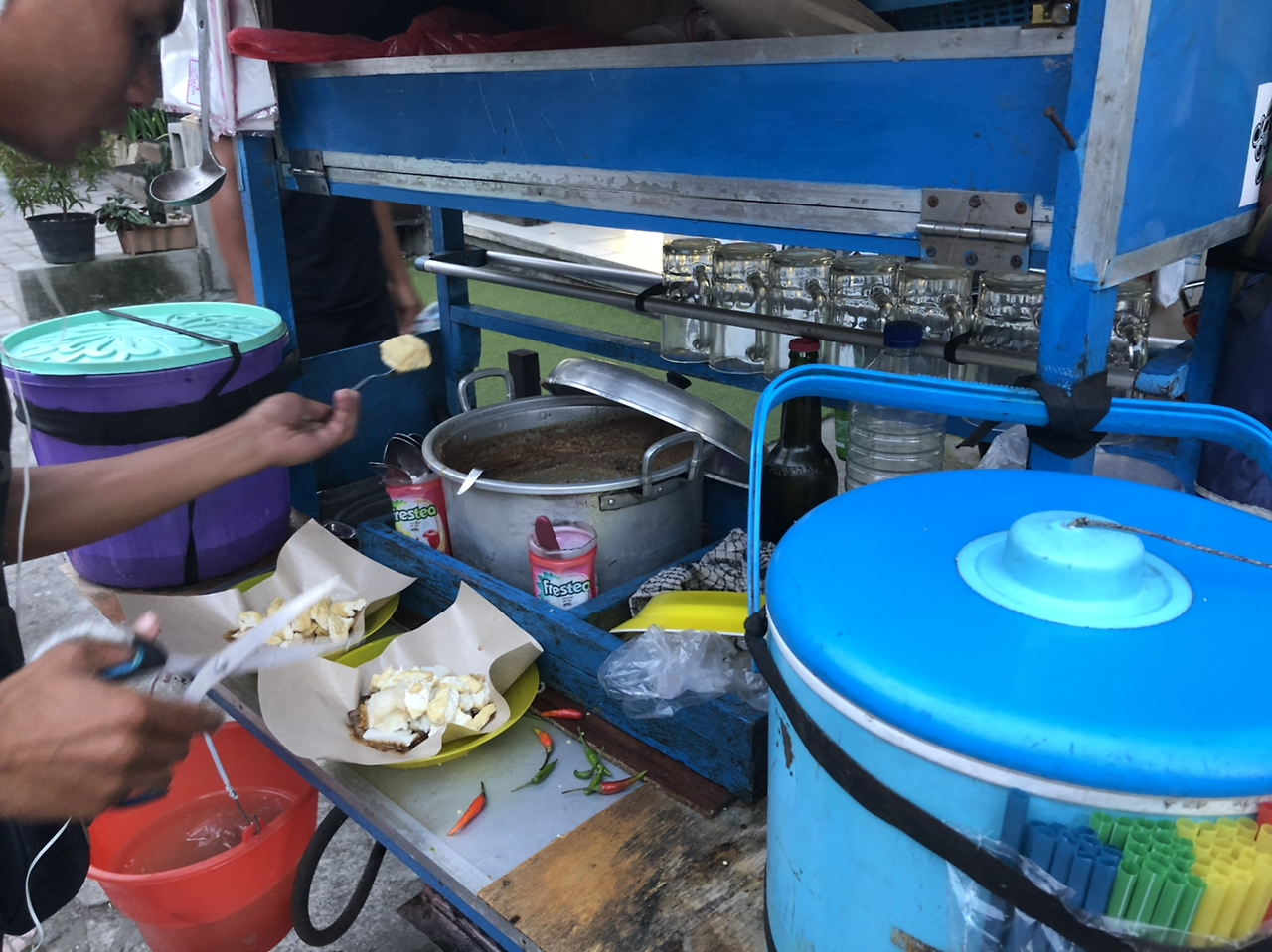 떡과 갓 튀긴 두부와 숙주나물 같은 것을 땅콩 소스에 버무려 새우칩과 함께 줬다. 꽤나 먹을만했다. 음식을 가리키며 이름을 물었는데, 내가 가리킨 두부만을 바라보며 그것은 두부라며 "Tofu Tofu!"라고 대답했다. 옆에 서있던 오토바이 택시 아저씨와 여행사 주인에게도 물어봤으나, 다들 "Tofu"라고만 대답해서, 음식 이름을 알아내는 데는 실패했다. (나중에 알고 보니 Tipat이 이름이다. 수레에 써져있음)