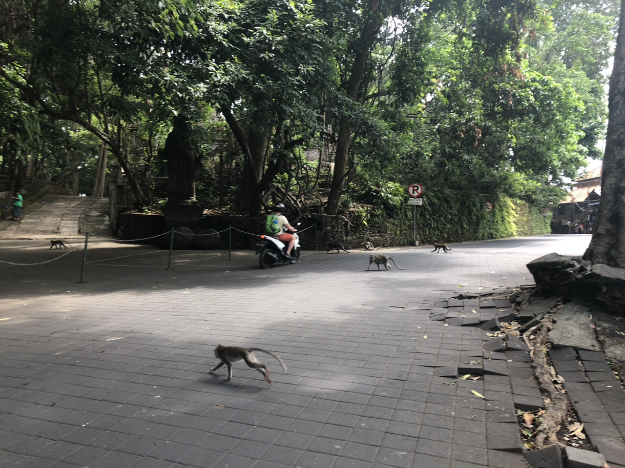 반 바퀴 정도를 돌다 보니 원숭이들이 딱히 인간에게 관심도 없어 보여서 안심하고 사진을 찍으며 돌아다니고 있었다. 그런데 갑자기 원숭이 한 마리가 날 타고 올라오는 것 아닌가. 난 신기해서 사진을 찍고 있었는데, 갑자기 백팩 지퍼 열리는 소리가 났다. 깜짝 놀라서 뭘 꺼내갔냐고 소리쳤더니, 주변에 관광객들과 직원이 아무것도 안 가져갔다며 가방을 벗으라고 해서 얼른 가방을 벗었다. 가방을 벗었더니 그 원숭이는 또 다른 관광객에게로 점프하여 백팩을 뒤졌다. 안전요원 말로는 먹을 게 있나 찾는 거라고 한다. 내가 메고 온 가방은 지난 중국 여행에서 샀던 도난 방지 백팩으로, 소매치기가 쉽게 지퍼를 열 수 없도록 안쪽 밑부분에 지퍼를 숨기도록 디자인되어 있었는데, 이렇게 발리 원숭이한테 털리다니.. 아무래도 내가 원숭이의 지능을 너무 간과했다.