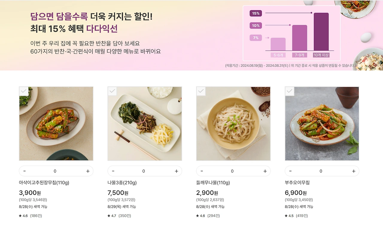 이렇게 재료 낭비와 시간을 절약하는데 도움을 주기 위해 출시한 '더반찬'은 반찬 정기구독 서비스로, 특히 집밥을 먹고 싶어 하는 사람들이 유독 찾는 서비스로 부상하고 있다. 매번 달라지는 반찬들을 정기로 배송받아볼 수 있고, 원하는 요일을 지정해서 배송받을 수 있으니 구독자들은 집에서 밥만 준비하면 든든한 식사를 할 수 있다. 여러 가지 반찬 메뉴들로 다양성을 누림과 동시에 식재료 낭비 고민에서도 벗어날 수 있으니 여러모로 생활의 편리함을 가져오는 구독 서비스로 볼 수 있다.