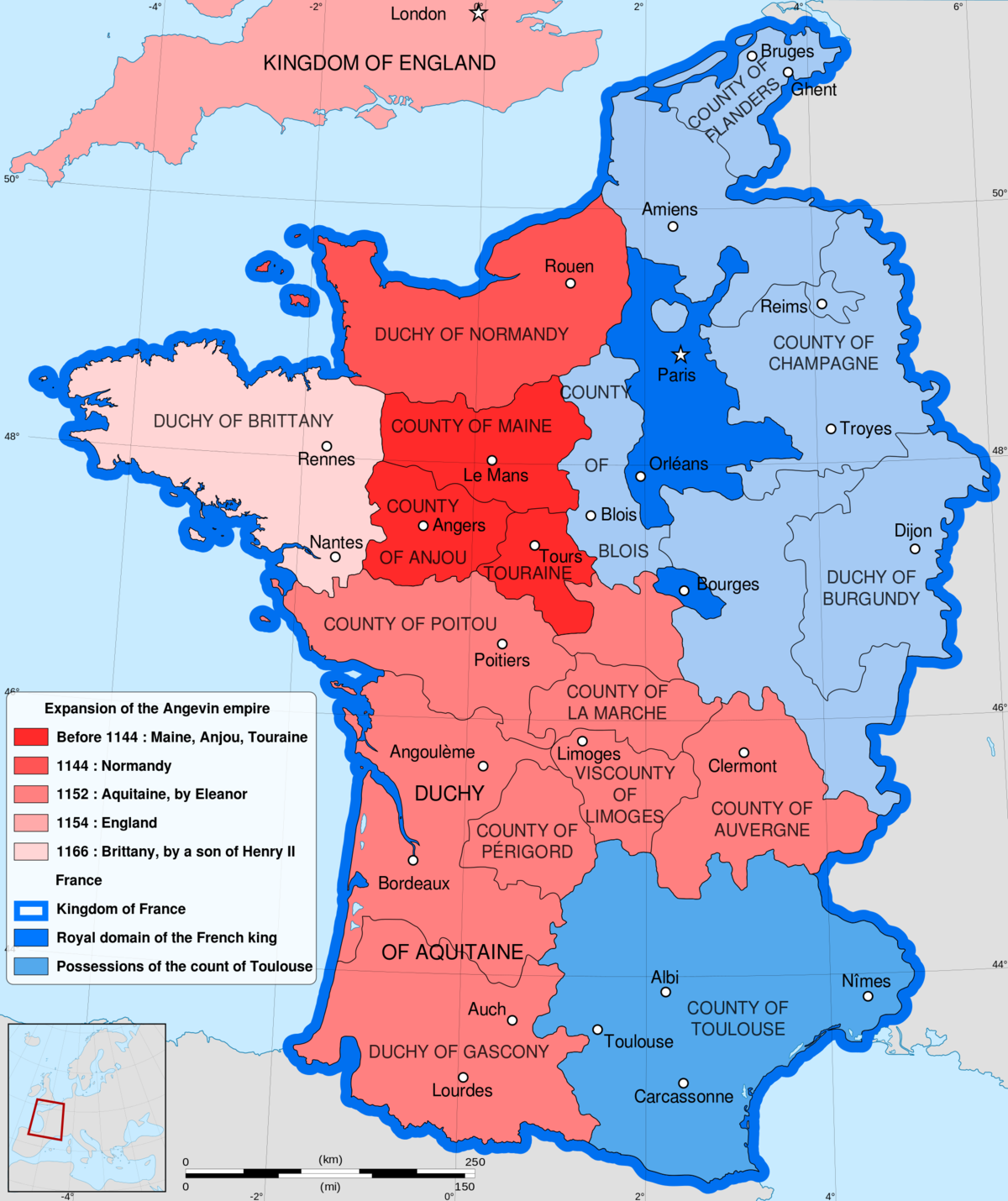 중세 프랑스, 이 중 상당수는 잉글랜드의 영토이고, 왕 직속 영토는 짙은 푸른색에 불과하다