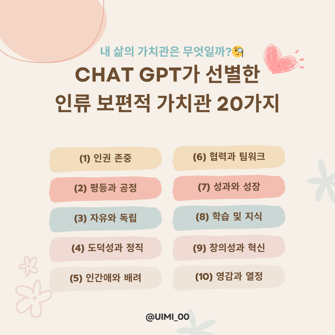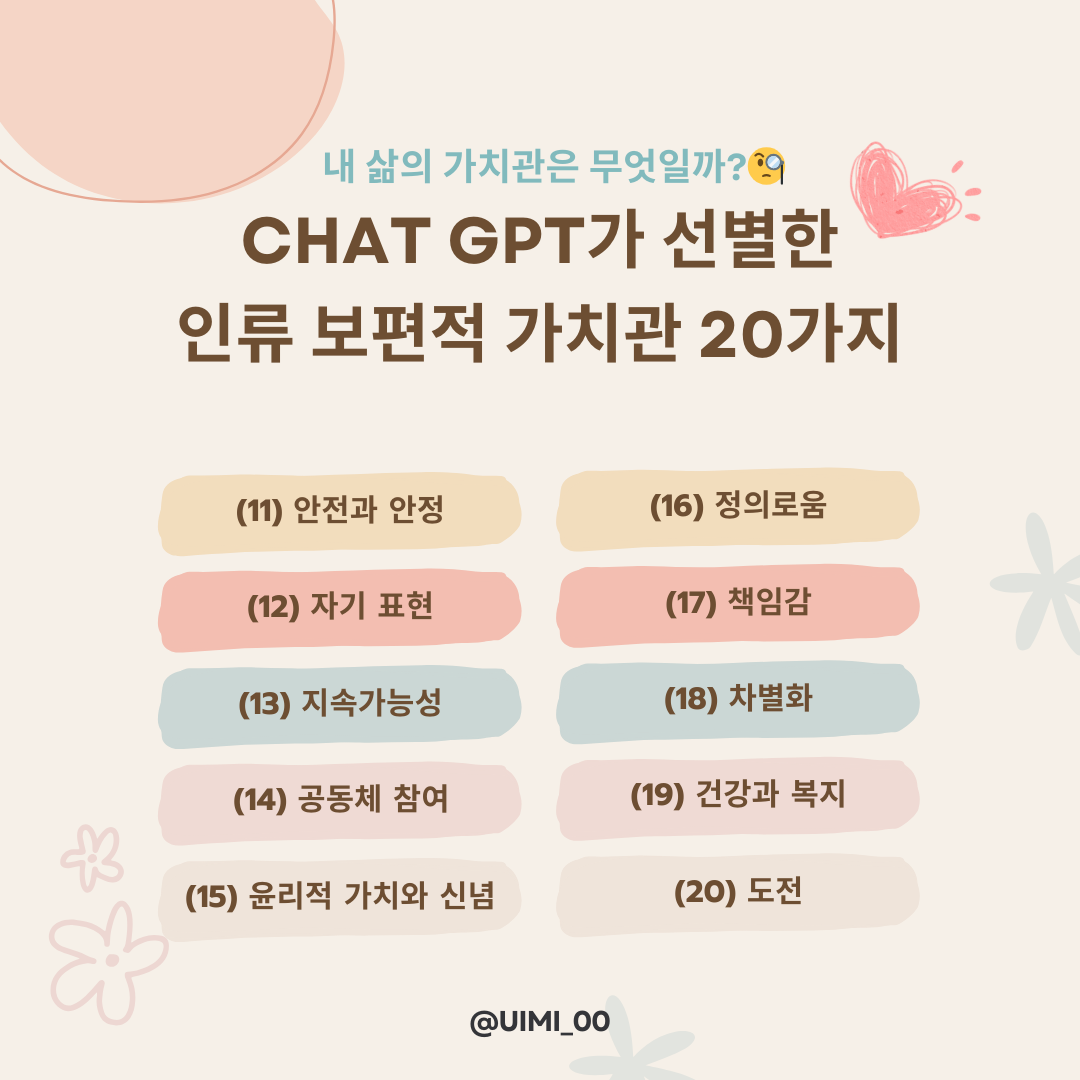 여러분이 창피함을 통해 발견하고 싶은 가치관, 신념, 우선순위는 무엇인가요? 이 질문에 수월하게 답할 수 있도록 ChatGPT에게 ‘21세기 현대인의 보편적인 가치관 20가지'를 물어봤어요.