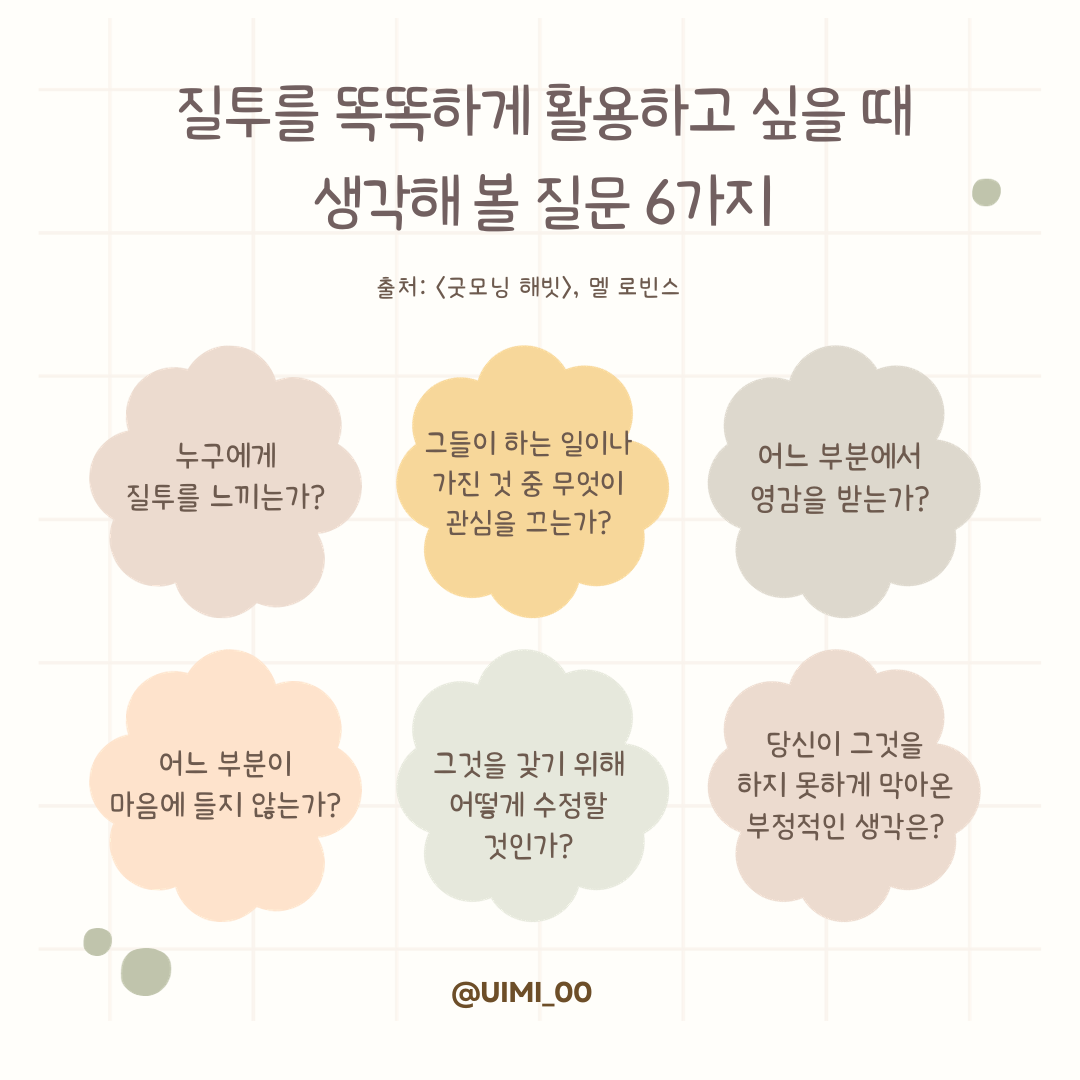 <굿모닝 해빗>의 저자가 책에 수록한 몇 가지 질문들도 질투를 현명하게 사용하도록 도와줄 테고요.