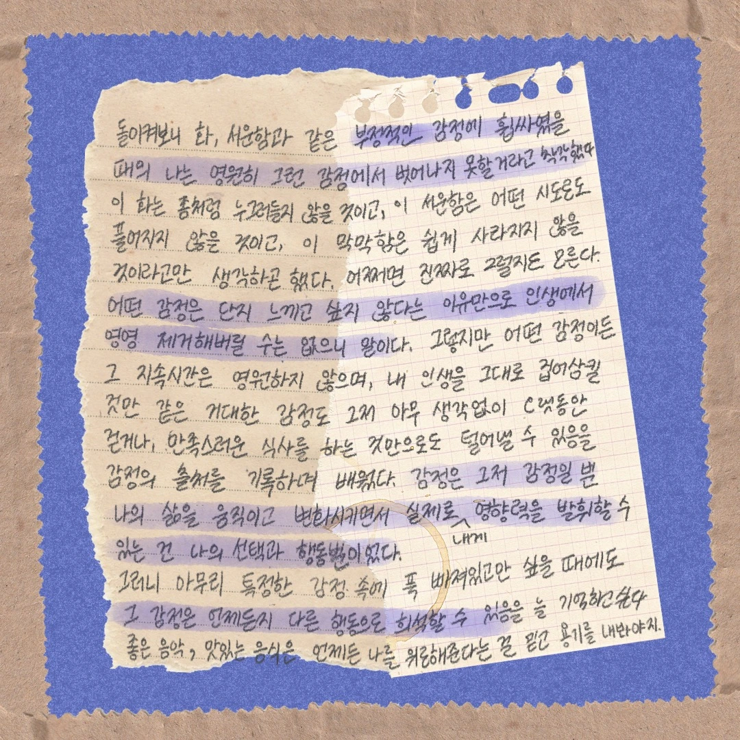 어쩌면 진짜로 그럴지도 모른다. 어떤 감정은 단지 느끼고 싶지 않다는 이유만으로 인생에서 영영 제거해 버릴 수는 없으니 말이다. 그렇지만 어떤 감정이든 그 지속시간은 영원하지 않으며, 내 인생을 그대로 집어 삼킬 것만 같은 거대한 감정도 그저 아무 생각 없이 오랫동안 걷거나, 만족스러운 식사를 하는 것만으로도 털어낼 수 있음을 감정의 출처를 기록하며 배웠다.